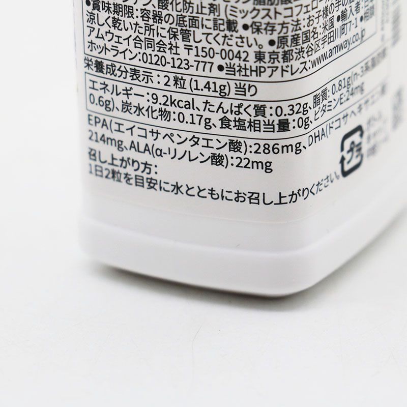 精製魚油、ゼラチン、チアシード油、ライム油、中鎖脂肪酸、ひまわり油、オリーブ油 / グリセリン、グリセリン脂肪酸エステル、トコフェロール、ヒマワリレシチン、酸化防止剤(ミックストコフェロール)