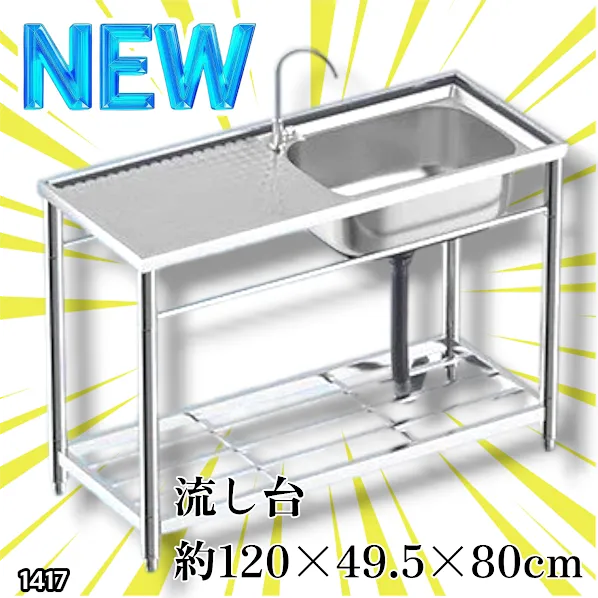 #1417 ステンレス製 厚みプラス 流し台 サイズ幅120×奥行き49.5×高さ80cm 深型シンク 蛇口付き 丈夫で長持ち 豊富な付属品 便利なタオル掛け S120 ※一部地域離島別途配送料有