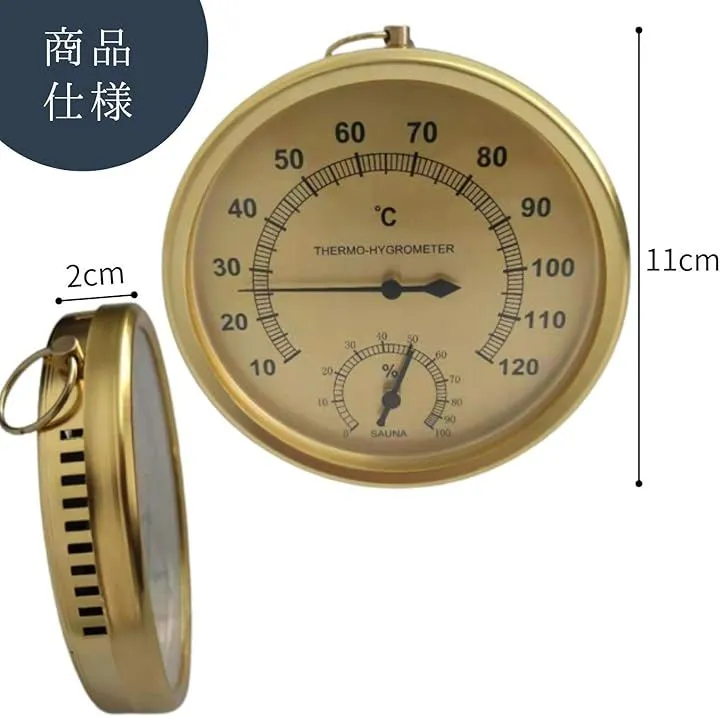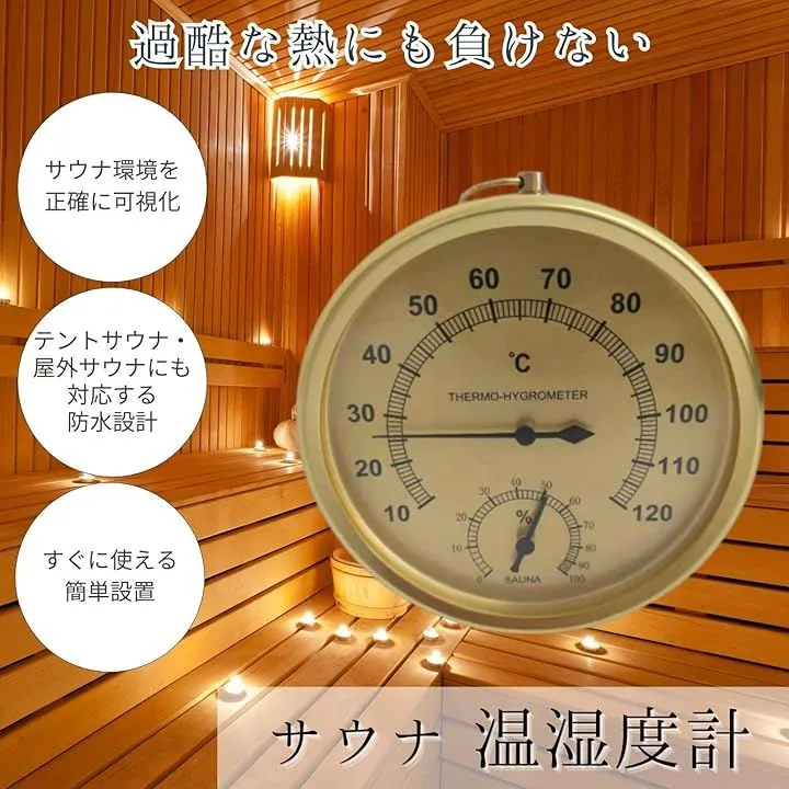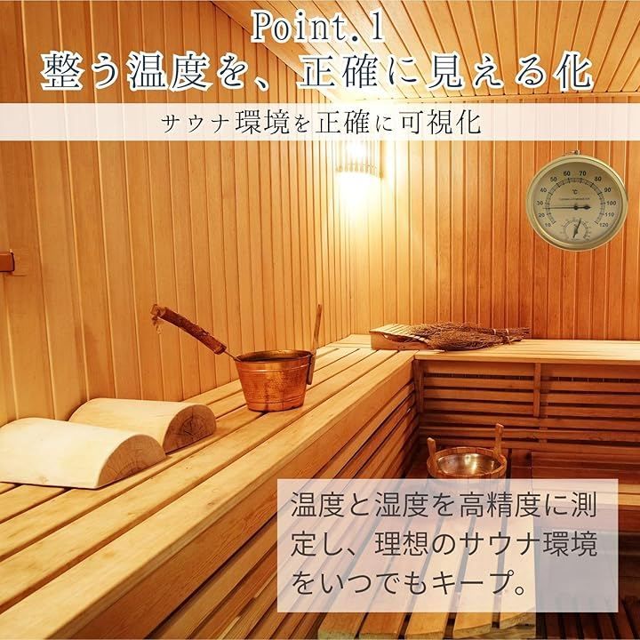 「サウナ環境を正確に可視化」 温度計と湿度計が一体化しているため、サウナ内の熱さと湿度のベストバランスを正確に把握できます。
