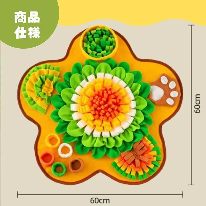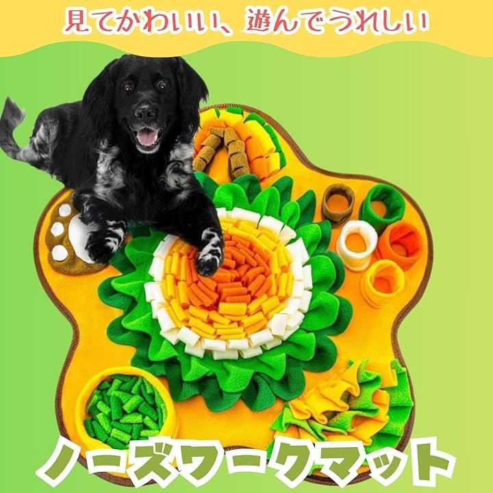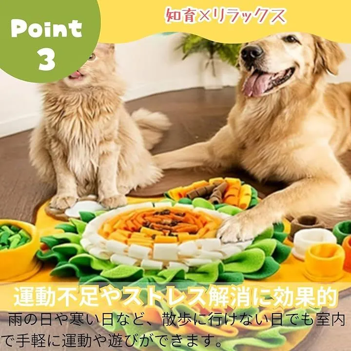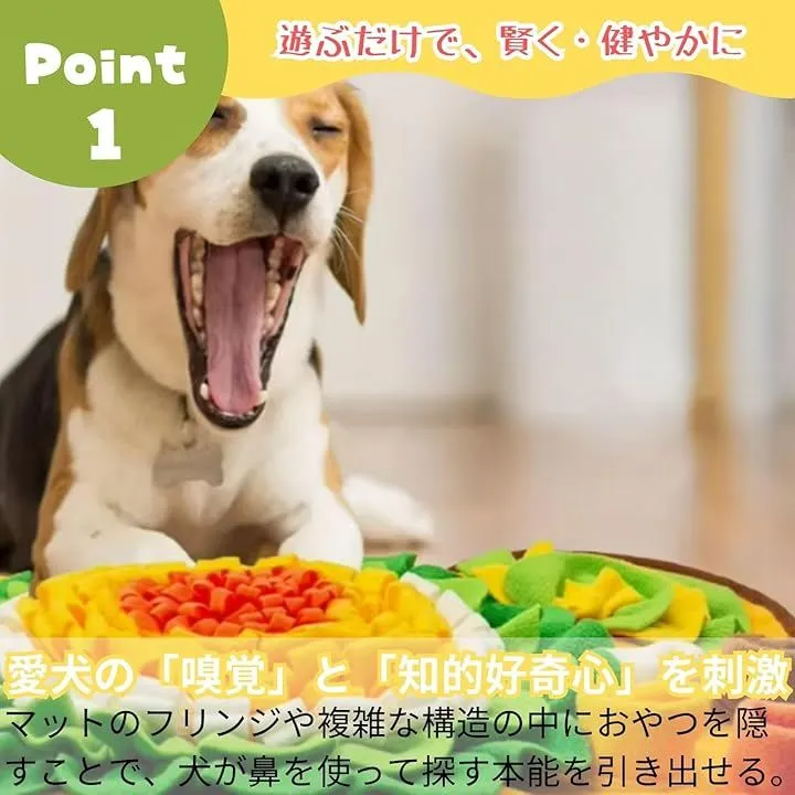 「愛犬の「嗅覚」と「知的好奇心」を刺激」 マットのフリンジや複雑な構造の中におやつを隠すことで、犬が鼻を使って探す(ノーズワーク)本能を引き出します。