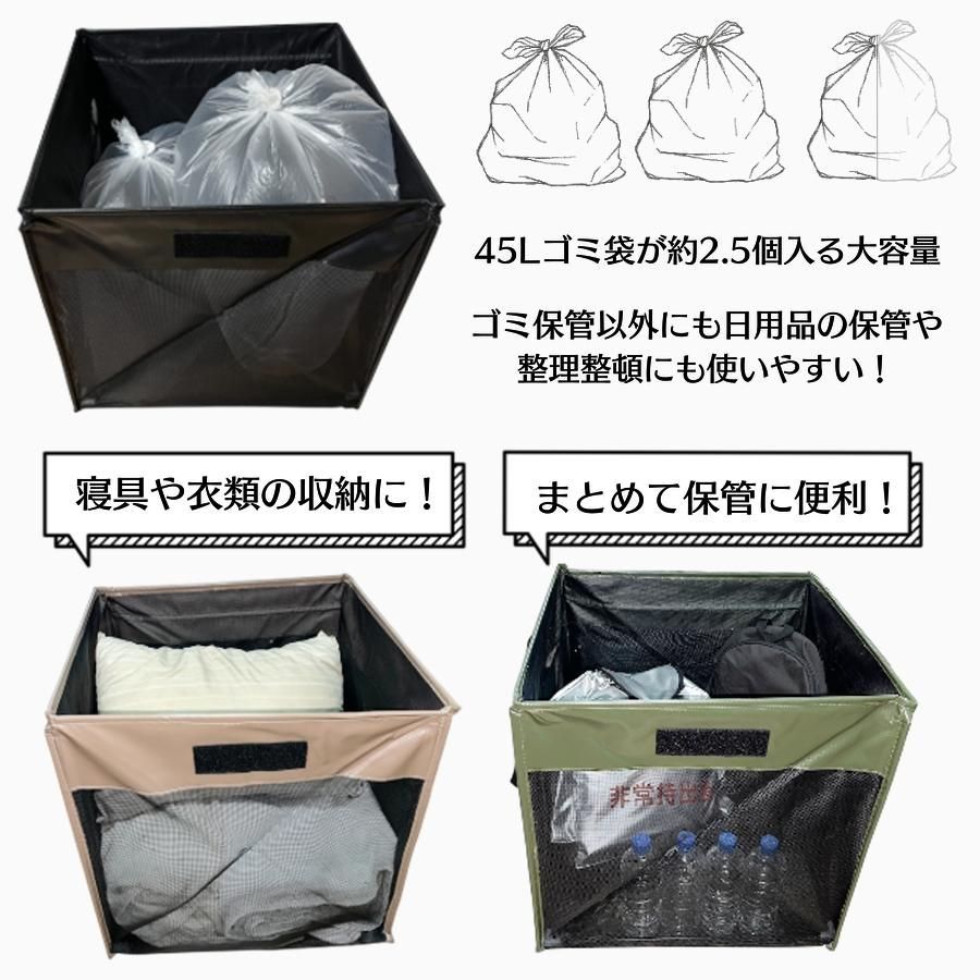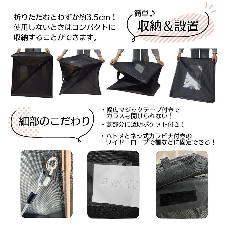【折りたたみ式】 コンパクトで持ち運びも簡単なので、ゴミステーション以外にもベランダなどでゴミを片づけすることも出来ます。ポリバケツや被せるタイプのゴミネットに比べて、ボックス型のゴミネットは取り扱いやすい構造となっています。全面がメッシュになっており、通気性がよく臭いがこもることがありません。また、汚れたとしても水洗いができ、雨の日でも撥水がよく水が溜まりません。 ⚠安全上のご注意⚠ ・生活ゴミや資源ゴミの一時置き以外の目的では使用しないでください。 ・火気や高温物に近づけたり放置しないでください。 ・平らな面で、がたつきのない安定した状態で使用してください。 ・内容物を入れたまま引きずらないでください。底部の破損に繋がります。 ・台風などの予測できない強風が発生する場合は、使用を控えてください。風で飛ばされるおそれがあります。 ・鋭利な形状のものを入れると破損のおそれがあります。 ・無理に大きなものを入れたり、詰め過ぎにはご注意ください。 ・汚れた場合は、固く絞ったスポンジや布で汚れを拭き取ってください。 ・直接日光が当たらない場所で保管してください。製品劣化の原因となります。 ・安全上、破損した場合は使用しないでください。 ・廃棄の際は、各地方自治体のルールに従ってください。