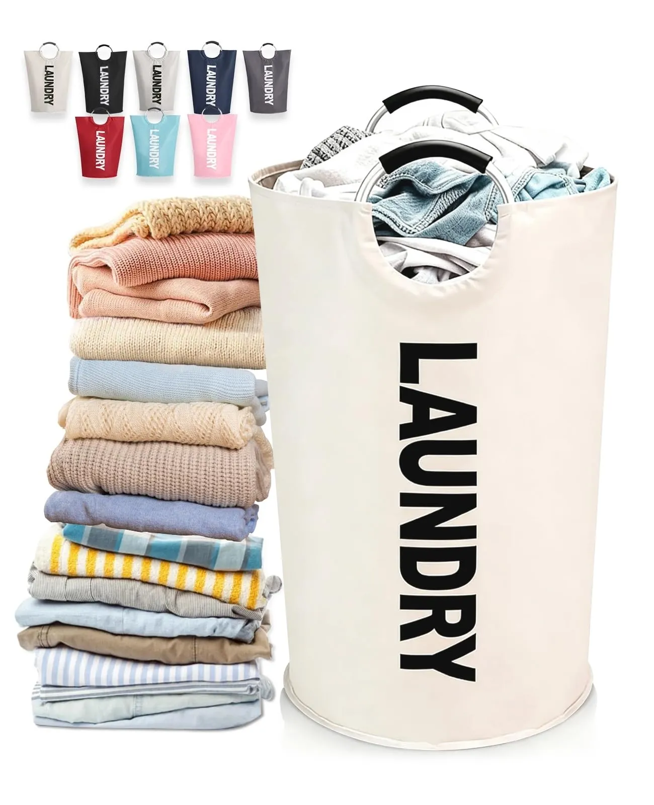 (オフホワイト) まとめ洗い・コインランドリー対応 家族用 取っ手付き 耐荷重15KG 自立式 撥水加工 折りたたみ 洗濯かご 大容量115L ランドリーバスケット