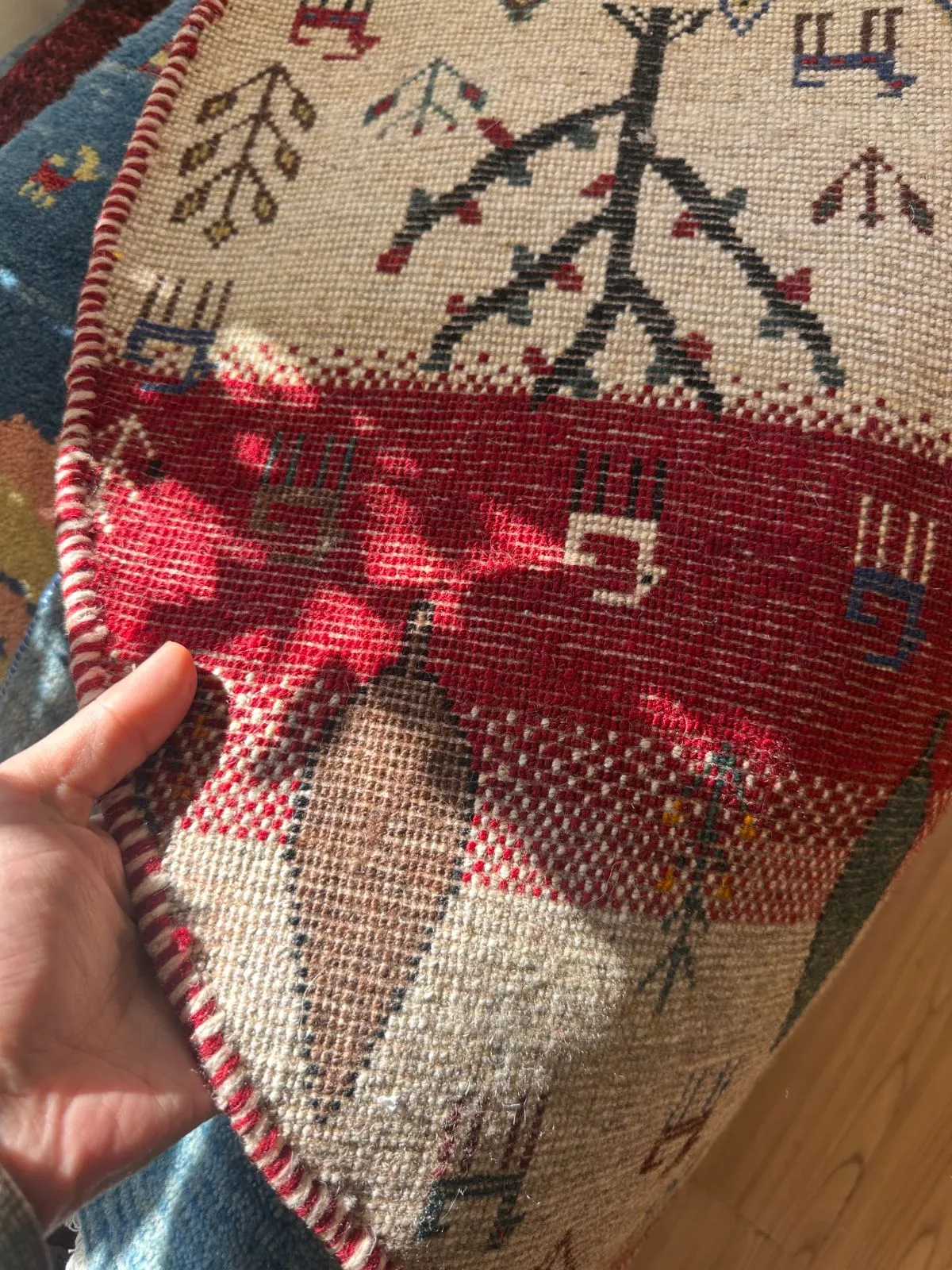【商品番号】H-95 手織り絨毯は全て一点物ですので現品限りです。店頭でも販売しているため先着順となりますこと予めご了承ください。 イラン シラーズ地方で手織りされたギャッベ。ギャッベとは手で紡いだ太めのウール糸でざっくりと織った厚みのある絨毯の種類で、素朴で可愛らしい色やデザインが特徴です。 ギャッベの中でも織りが細かい『カシュクリ』と呼ばれるグレードの高いものです。こちらは通常のギャッベに使用されるウールより更に細く紡がれたウール糸を用いているため、織りの密度も高く、細かなデザインまで鮮明です。 ラウンド形がユニークな主役級の可愛らしさ。 ふっかふかなので上に寝転んでも気持ちがよく、サイズが主張し過ぎないのでラグとしてはもちろん、ソファに掛けたりタペストリーとして使用しても面白いインテリアになります。 草木やスパイスで作った自然染料で鮮やかに仕上げた色彩豊かな配色バランスもとっても美しい。 一結び一結び職人がまごころ込めて手織りした芸術品です。 ※ご購入の際は、恐れ入りますが、ABOUTページ下部にございます注意事項を購入前に必ずご確認いただきますようお願いいたします。 Decorworks