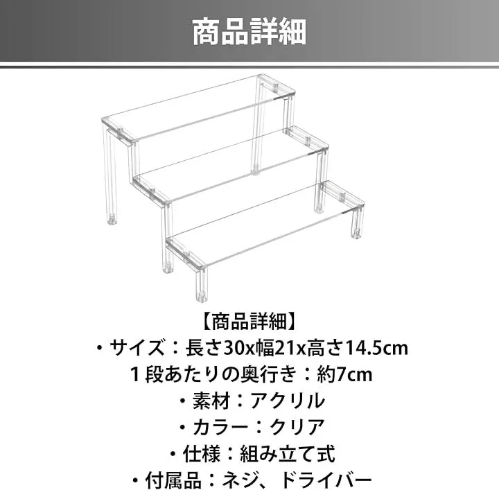 「商品詳細」 ・サイズ:長さ30x幅21x高さ14.5cm ・素材:アクリル ・カラー:クリア ・仕様:組み立て式 ・付属品:ネジ、ドライバー