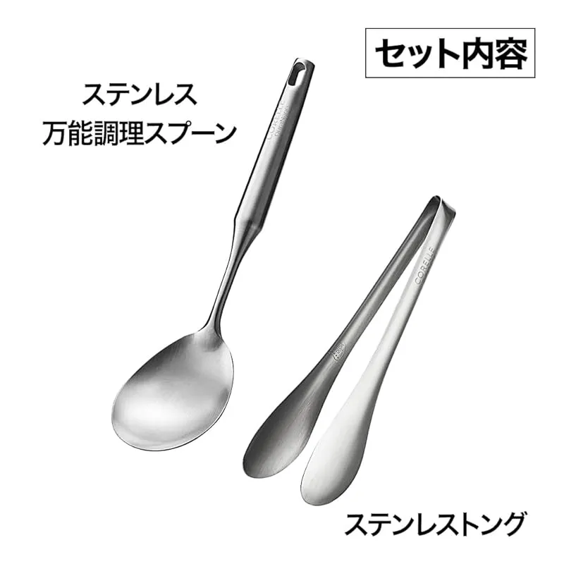 【新品】 CORELLE(コレール) キッチンツール2点セット 万能調理スプーン トング 継ぎ目のない ステンレス 食洗器対応 お手入れ簡単 盛り付け ドウシシャ