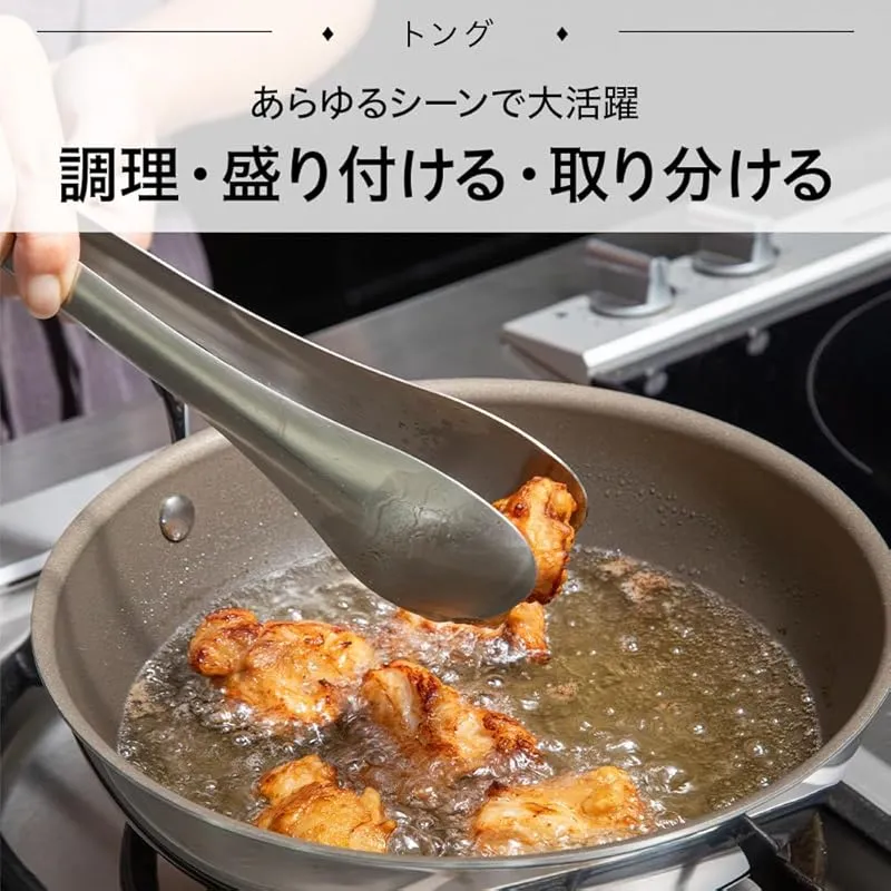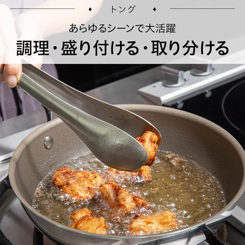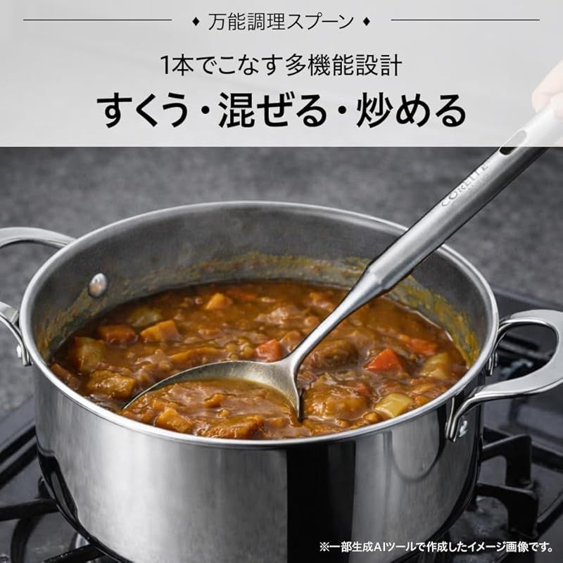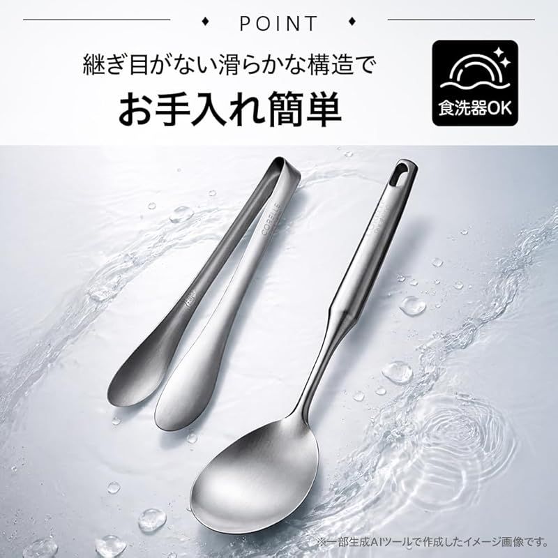 【商品概要】 万能調理スプーンとトングの2点セット。コレールフライパンと合わせて使うことを前提とした、スタイリッシュなデザインの万能調理スプーンとトングの2点セットです。調理から盛り付けまで、さまざまなシーンで活躍します。 オールステンレス製だから丈夫で長持ち。万能調理スプーン、トングともに、フライパン本体のデザインに合わせた高級感のあるオールステンレス製のため、耐久性に優れ、高温調理も可能です。また、凹凸や継ぎ目のないシームレス形状のため、汚れがたまりにくく洗いやすい設計です。食洗機にも対応しているため、日々のお手入れも簡単です。 万能調理スプーン:すくう、混ぜる、炒めるを1本で。 トング:洗いやすく衛生的、しっかりつかめる。凹凸や継ぎ目のないシームレス形状で汚れがたまりにくく、洗いやすい仕様です。衛生的に使えるだけでなく、しっかりつかめる操作性を備えており、調理・盛り付け・取り分けまで幅広く活躍します。 万能調理スプーン:サイズ(31×7.8)重さ(128g)、トング:サイズ(23×4.8)重さ(93g)