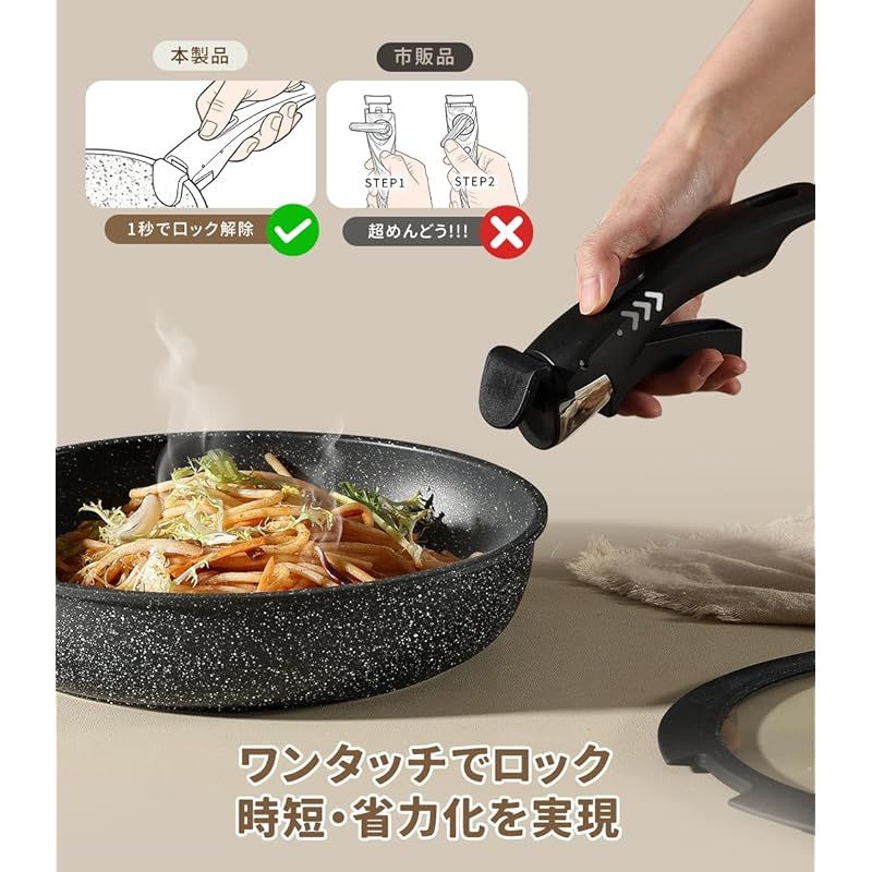【着脱式専用取っ手】簡単に取り外せる専用取っ手、いろんなシーンに合わせて便利に使えます。取っ手が邪魔にならないため、スペースが限られた場所にも収納できます。調理後は、鍋敷きを置いた食卓に出すことも可能です ??