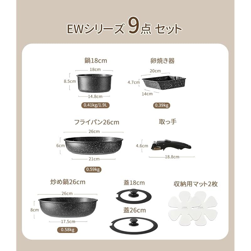 【セット内容・材質】鍋18cm/0.41kg、卵焼きフライパン0.39kg、フライパン26cm/0.59kg、炒め鍋26cm/0.58kg、18・26cmガラス蓋、専用取っ手(最新型)×1本、収納用マット*2枚、梱包重量(約): 3.2kg ??