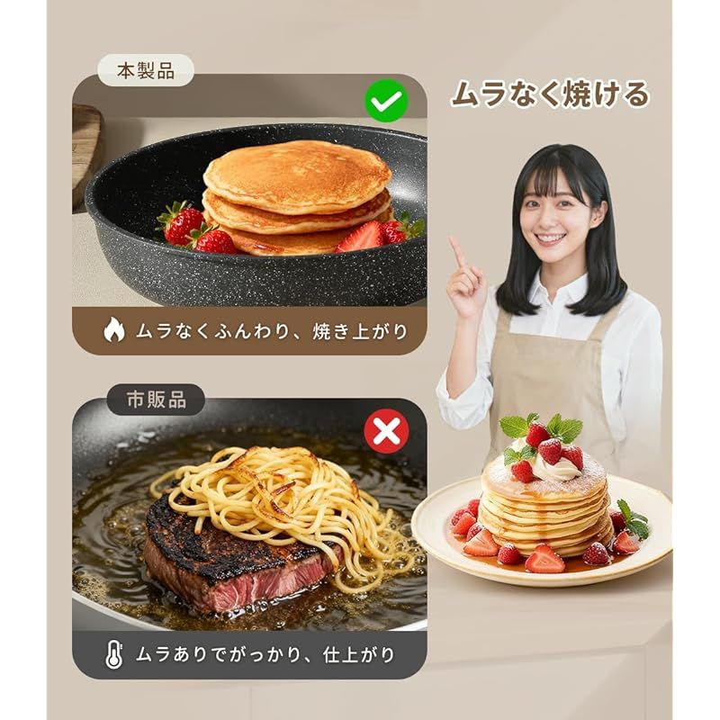 【快適な調理体験】内面がマーブルコートをしているため、くっつきにくくスムーズに調理できます。調理後もスポンジで軽く拭くだけで、汚れもスルッと落ちます ??