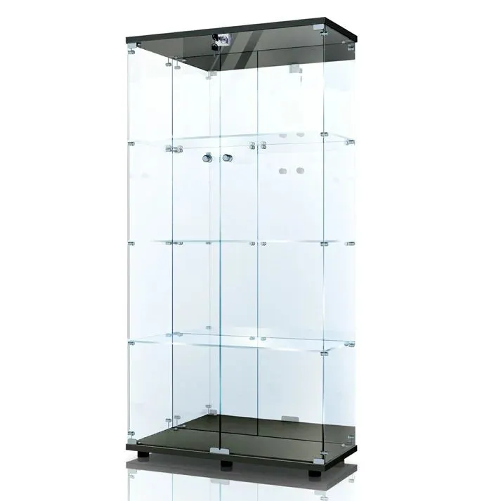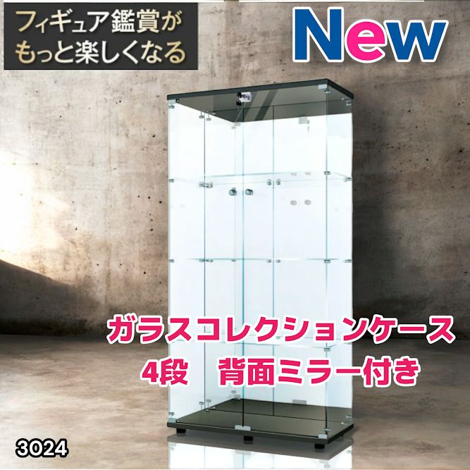 #3024 ショーケース ガラスケース 背面ミラー付き 4段 両扉タイプ ブラック 黒色 鍵付き コレクションケース フィギュアケース 棚 キャビネット 大型 ※一部地域離島別途配送料有