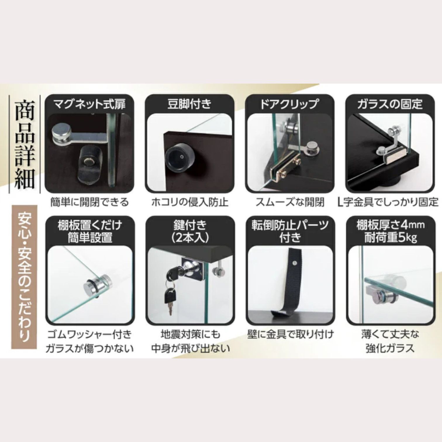 【安心・安全設計】🔐 カギ付きなので、店舗での使用や大切なコレクションの保管も安心。 扉はマグネット式のため、施錠していない状態でもしっかり閉まります。 転倒防止金具付きで地震対策も考慮。豆脚付きで床からのホコリの侵入も軽減します。