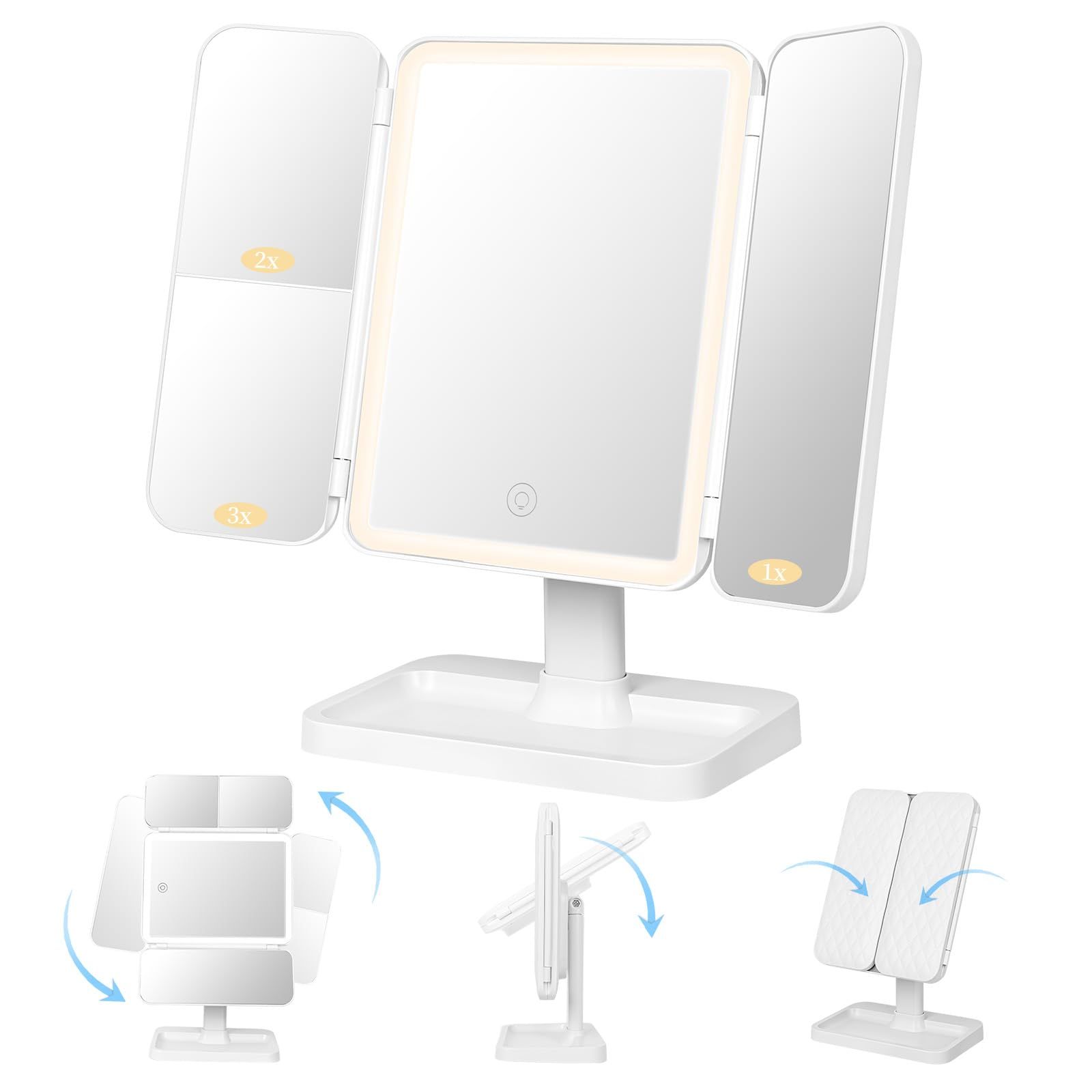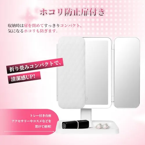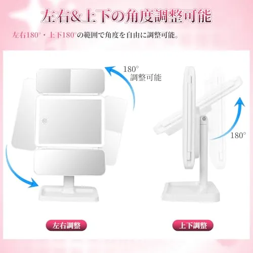 [Candybay]女優ミラー 三面鏡 卓上 ライト付き 【メイクアップアーティスト監修】化粧鏡 3色光モード 角度自在調整 2X/3X拡大ミラー USB充電 スマホスタンド付き 収納ペース 6cm伸縮可能 (ホワイト)/