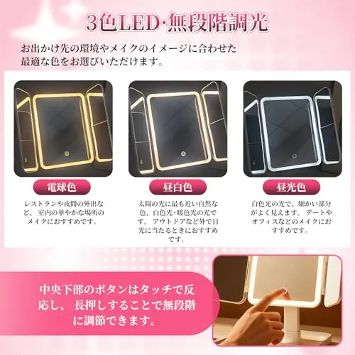 【三種類のモード】 色が3色(電球色・昼白色・昼光色)から選び、様々な場面を適用、化粧が楽しくなります。家の中でも太陽に近い光でメイクできる新型なプロライト付きミラーです。