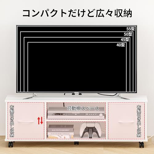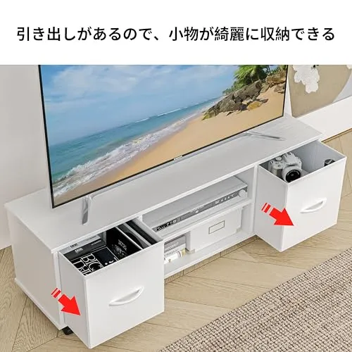 【多機能収納テレビ台】32・42・55型のテレビサイズが対応できる、天板は DVD機器、AV機器やゲーム機を置くのにちょうどよい広さを備えています。A4サイズの雑誌や書籍が収納できる棚板を付属しており、日常の文房具や小物類も整然とまとめられ、リビングの雰囲気を損ないません。本体に2口コンセントを搭載しています。散乱しがちな配線のスッキリ整理が可能で、室内の雑然感が解消できる、居住環境の清潔感を高めます。併せて布製引き出しを2個付属しており、充実した収納力を発揮し、リモコンやゲームソフトなどの小物類が隠して収納できる、室内のすっきり感を長く保つことができます。