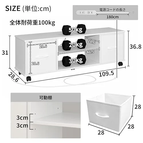 LunarLight テレビ台 幅109.5奥行28.6高さ36.8cm テレビボード ローボード コンセント付き 布製引き出し付き 多機能収納ボックス 収納棚板調節可能 32型/42型/55型テレビ対応 収納 組立簡単 工具不要 耐震転倒防止 総耐荷重100