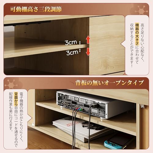 オープンラック:中央の棚板は上下3段階調整可能で、収納物のサイズに合わせて調整できます。背板のないデザインなので通気性もよいです。中央のオープンサイズの幅59cmx22cmで、レコーダー・サウンドバー・DVDプレイヤーなどのAV機器は二台同時に収納することができます。