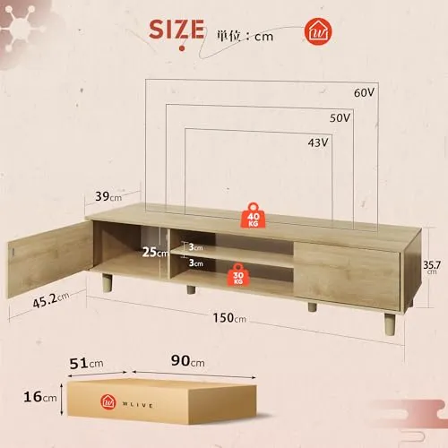 広々とした天板:幅150cm、奥行39cmの天板スペースを有効活用しましょう。自分の好きなディスプレイを楽しめる天板スペ一ス、自由な発想で、素敵なコ一ディネ一トをお楽しみください。150cmの長さはちょうどいいサイズで、最大60インチのテレビが対応できます。家族と一緒に素敵なテレビの時間を楽しみましょう。35.7cm高さのロータイプ設計で、部屋に圧迫感を与えずに、一人暮らしの狭い部屋にも、視界を遮らずすっきりと設置できます。
