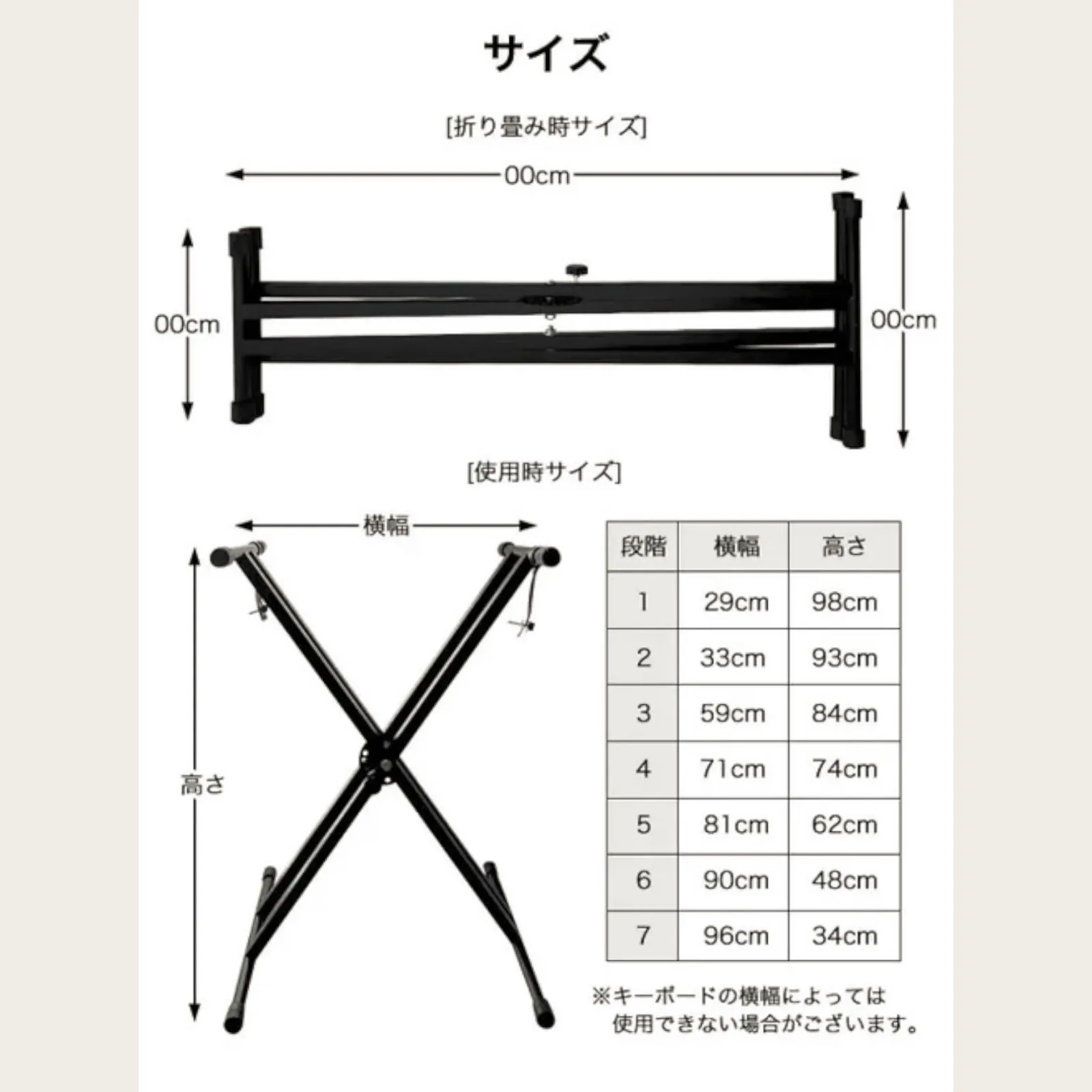 【キーボードサイズ】 幅:29cm(高さ98cm)~96cm(高さ34cm) 奥行き:足部分/43cm キーボード設置部分/33cm 使用時の高さ:34cm~約98cm(座奏~立奏)