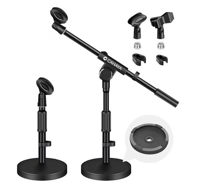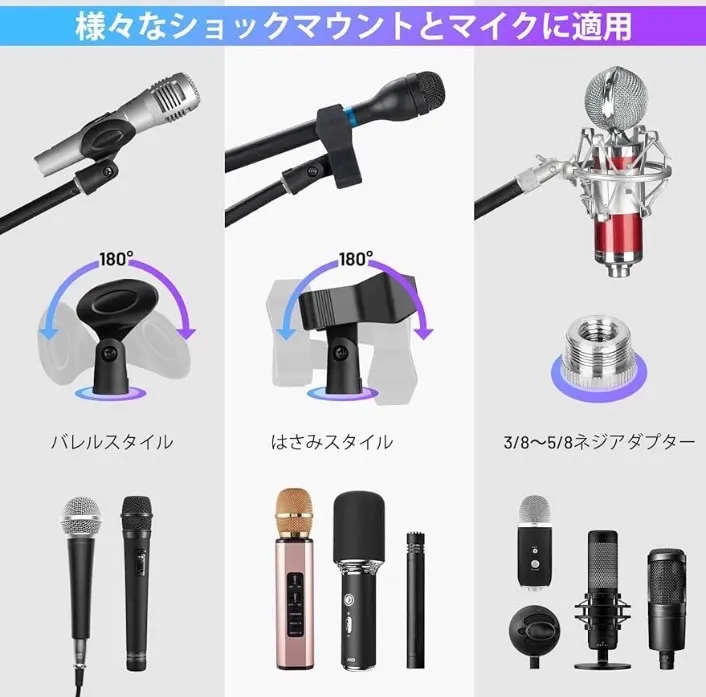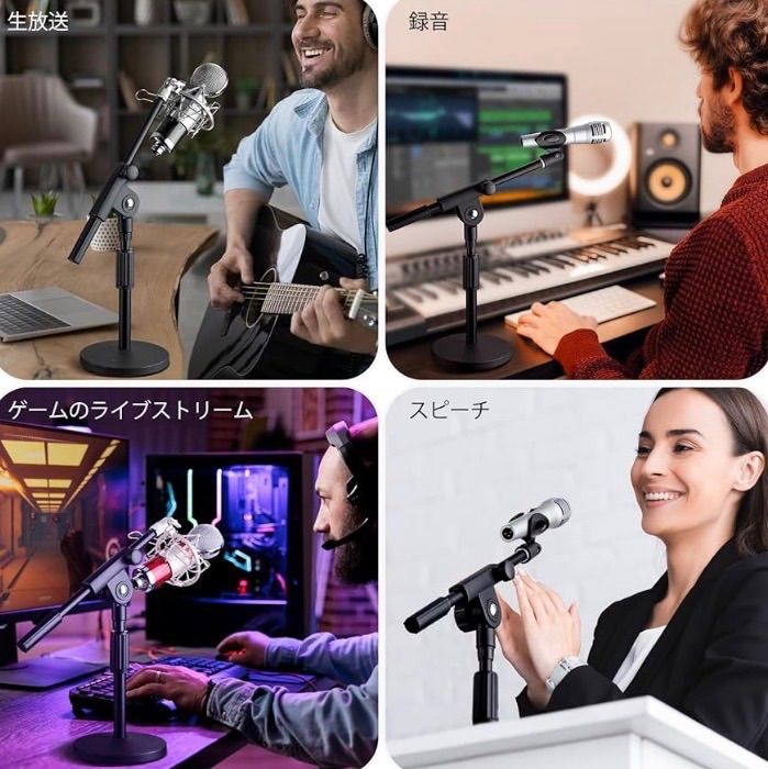 【多用途・パッケージの内容】この卓上マイクスタンドは多用途で、有線マイク、ワイヤレスマイク、コンデンサーマイクなどに適用します。また、このパッケージにはマイクスタンド×1、鉄製ベース×1、マイククリップ×2、ケーブルカバー×2 があります。マイククリップが付いて好きなように置き換えて使えます。鉄製ベースが付いてどこに置いても安定感があり安心です。