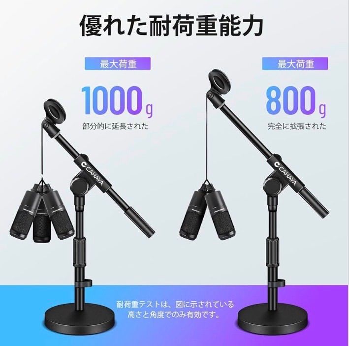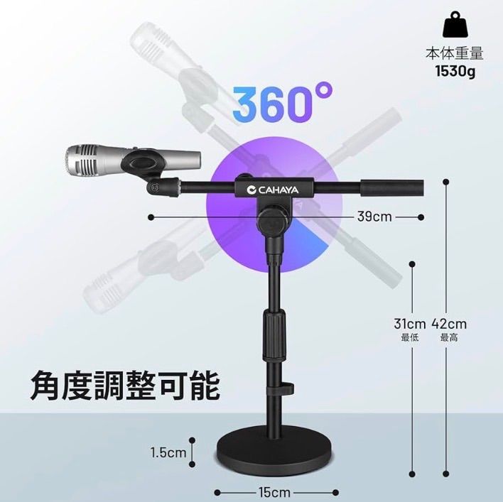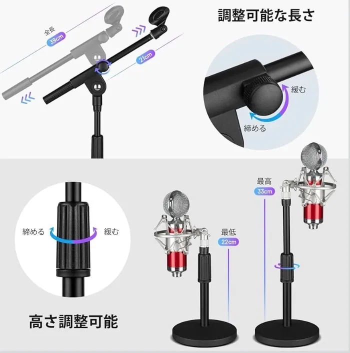 【360°調整・鉄製安定なベース】この卓上マイクスタンドは、360°自由にマイクスタンドのブーム角度を調整でき、もっと快適です。また、鉄製1058g超安定したベースが付いて、ベース底部には厚いスポンジパッドも付いて、滑り止めることができ、よく保護できます。