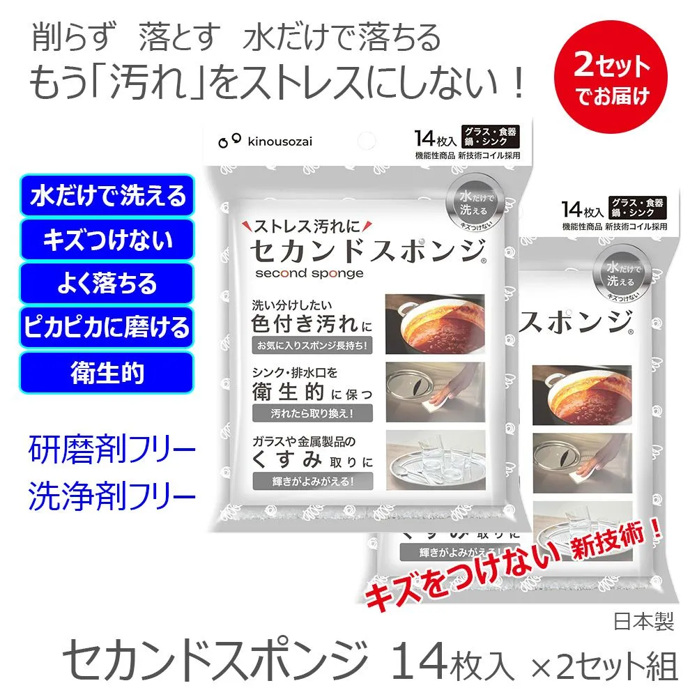 機能素材 水だけでピカピカ 削らず落とす 新技術 キズつけない 使い捨て いろいろなものに使える 気軽に使える セカンドスポンジ 14枚入×2セット