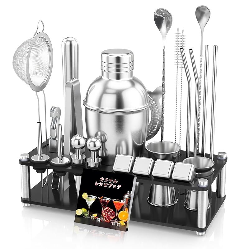 【新品】 Housolution カクテルシェーカー 550ml 25点セット バーテンダーセット 防錆 S304ステンレス製 収納スタンド付き レシピ付き 家庭用/業務用 Silver