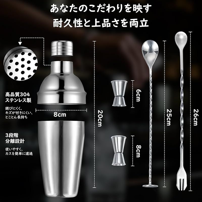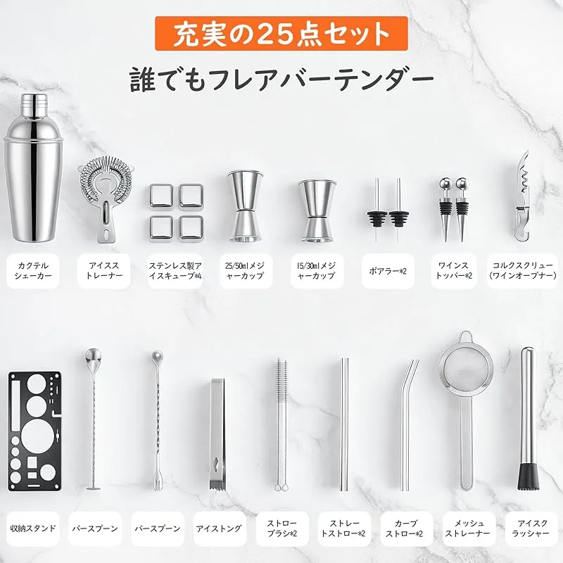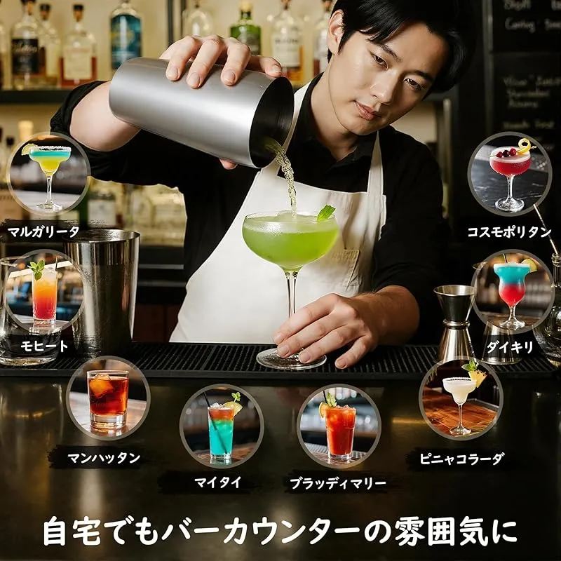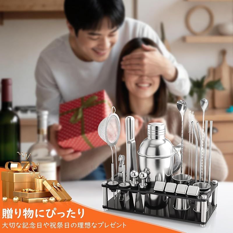 【商品概要】 「プロ仕様の豪華25点カクテルシェーカーセット」ご自宅で本格的なバーの雰囲気を楽しめる、25点のカクテルシェーカーセットです。シェーカーをはじめ、バースプーン、ジガー、ストレーナー、クラッシャーなど、プロのバーテンダーが使用するツールを一式揃えており、初心者から上級者まで幅広く活躍できるセット内容となっています。お気に入りのリキュールやフルーツを使って、気軽にオリジナルカクテルを作ってみましょう。 「上質なS304ステンレス使用」ツール類にはすべて、錆びにくく衛生的な高品質S304ステンレス鋼を採用しており、優れた耐腐食性と耐久性により、長期間使用しても新品のような輝きを保ちます。水洗いはもちろん、食洗機にも対応しているため、使用後のお手入れもとても簡単です。家庭用としてはもちろん、業務用としても十分に対応できる品質です。 「美しく収納できる専用スタンド」全てのバーツールをコンパクトに収納できるアクリル製スタンドが付属してあり、ツールをひと目で見つけられる設計で、実用性はもちろん、インテリアとしても美しく、キッチンやホームバーに映えるモダンなデザインです。省スペースで整理整頓ができ、片付けも簡単で行えます。 「初心者も安心のレシピ付き」クラシックカクテルから定番の人気レシピまで、手順が丁寧に解説されたレシピブックが付属しています。初めての方でも迷わずに作れる内容となっており、ご家庭で本格的なカクテルを再現可能で、経験豊富な方にとっても、新しいアレンジやアイデアを広げるヒントとなることでしょう。 「贈り物に最適な上品デザイン」洗練されたデザインと実用性を兼ね備えたこのシェーカーセットは、誕生日、クリスマス、引っ越し祝い、結婚祝いなど、様々なギフトシーンにぴったりです。ご家族、ご友人、同僚、お取引先へのプレゼントとしても喜ばれ、手作りの一杯を楽しむ贅沢な時間を提供します。