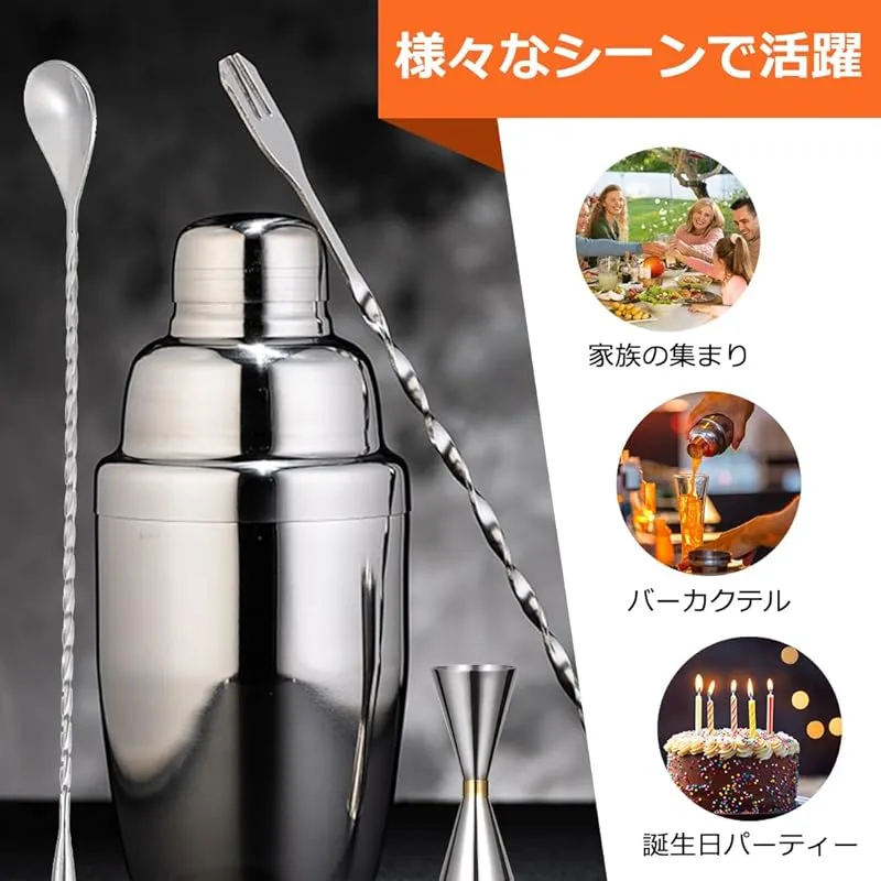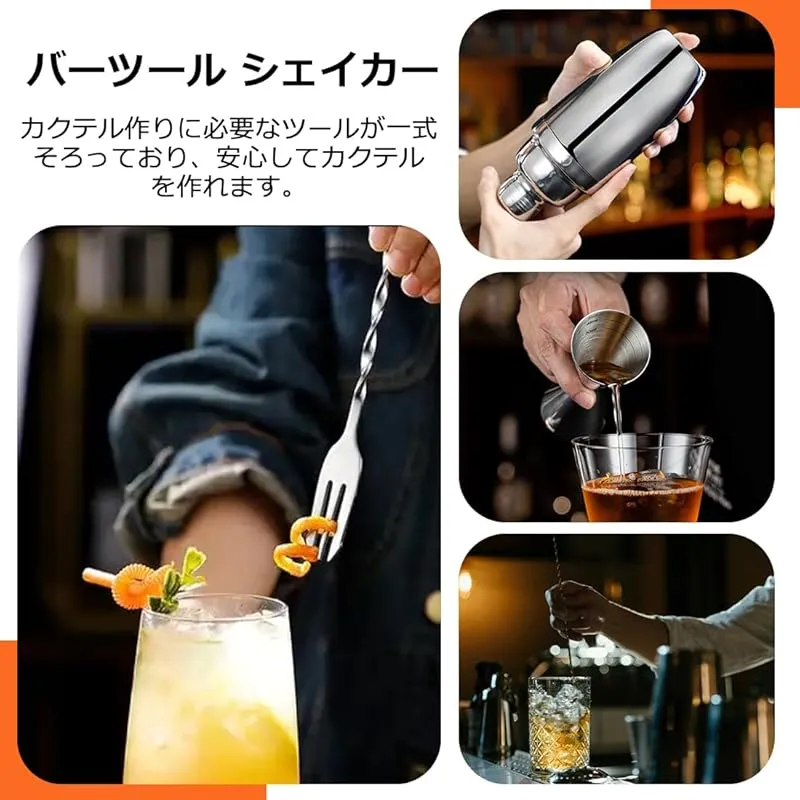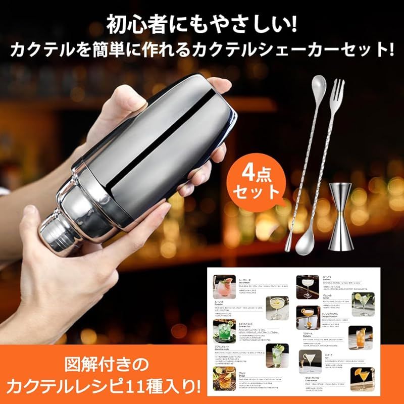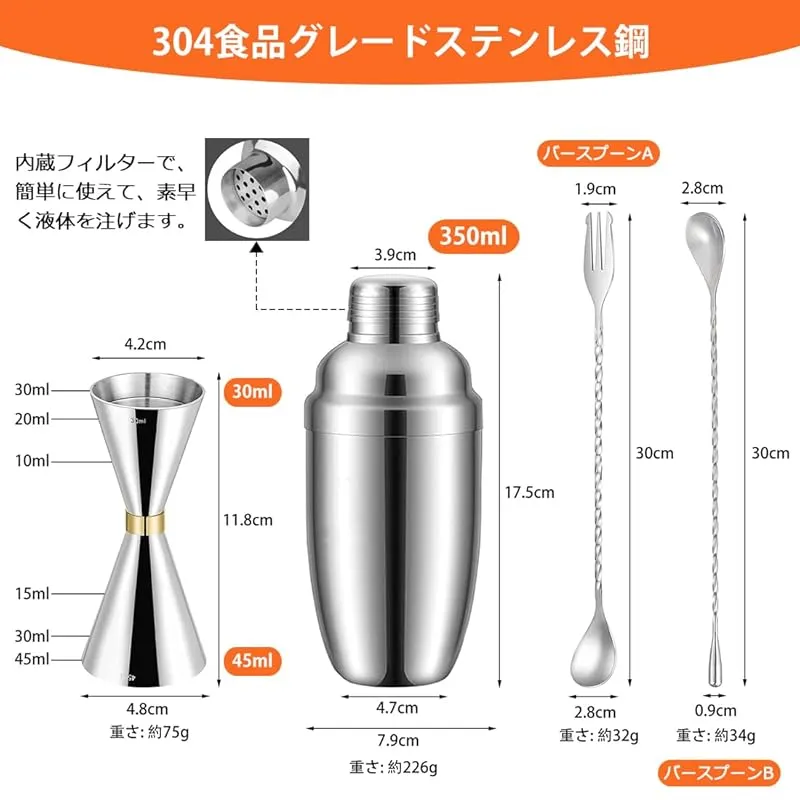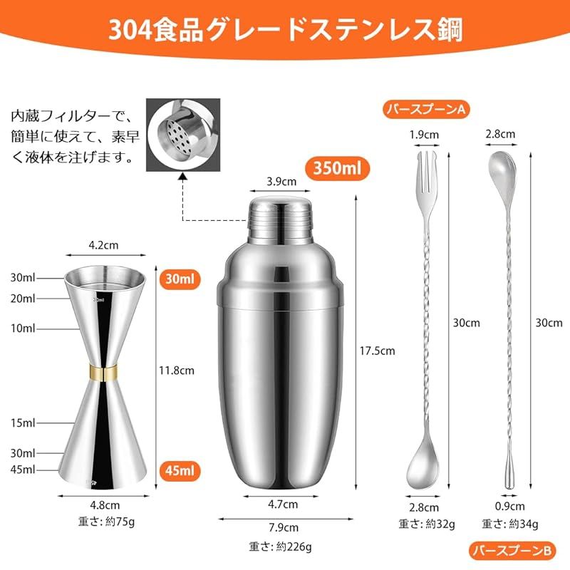 【仕様&材質】:カクテルシェーカーサイズ: 7.8x7.8x18cm、ジガーカップサイズ:11.8×4.×4.2cm、バースプーンAサイズ:30×2.8×1.9cm、バースプーンBサイズ:30×2.8×0.9cm 、材質:ステンレス、入数:4点セット、色:シルバー。このカクテルシェーカーセットは、バーテンダー愛好家、初心者、プロのバーテンダーに最適です。