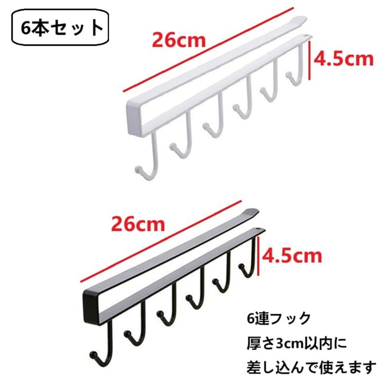 【商品概要】 「商品仕様」:素材:アイオン、セット内容:6本セット(ホワイト×3、ブラック×3)、サイズ:奥26cm、フックの高さ4.5cm。6連フックのタイプで、厚さ3cm以内の吊戸棚の底板やドアなどに差し込んで使えます。 「材質について」:本製品は高品質な鉄素材を使用し、表面には安全な防水コーティングが施されています。非常に頑丈で耐久性があり、湿気の多いキッチン環境でも長期間使用できます。また、通気性と安定性も兼ね備えており、安心してご使用いただけます。 「省スペース」:吊り下げタイプのフックなので、限られたスペースを有効活用できます。キッチンやバスルーム、クローゼットなどで、場所を取らずに収納でき、スペースをすっきり整理することが可能です。 「多機能」:キッチンの戸棚下に横に取り付けでき、複数のカップや食器、キッチンツールを整理することができます。また、玄関のドア裏やクローゼット内にに立てかけて、大衣やネクタイ、バック、帽子などを収納することができます。 「適用シーン」:ジャケット、帽子、カップ、マグ、タオル、キッチンツール、帽子、傘、バッグ、スカーフ、ペット用リードなどを掛けるのに最適です。キッチン、戸棚下、リビングやクローゼット、玄関など様々な場所で活躍します。