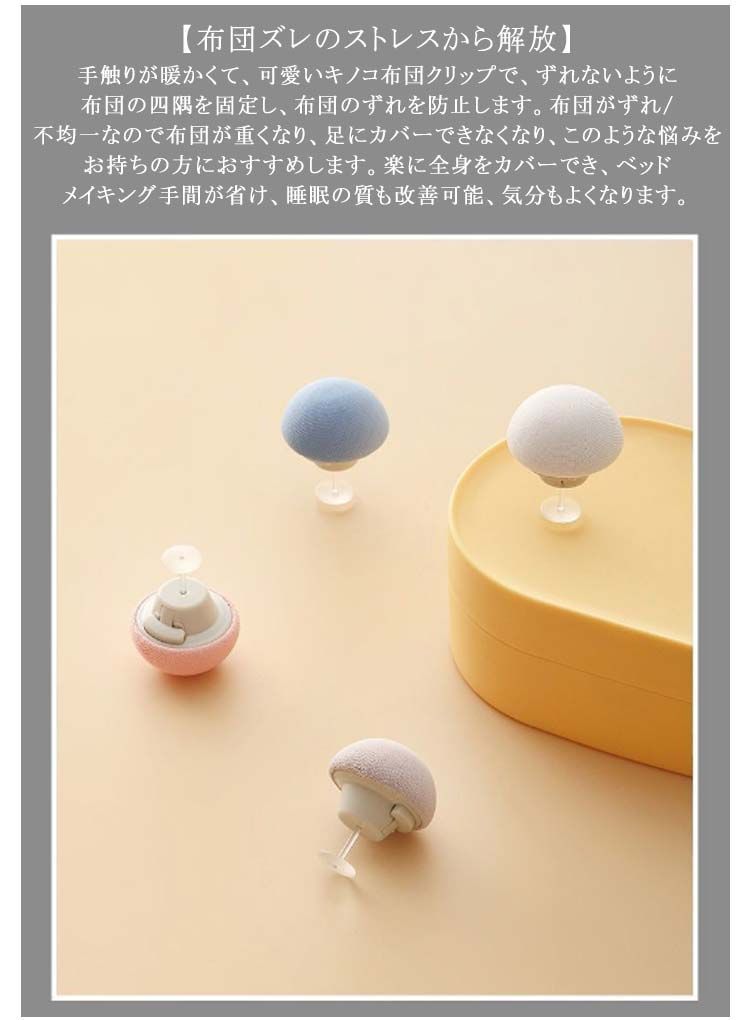 【布団ズレのストレスから解放】手触りが暖かくて、可愛いキノコ布団クリップで、ずれないように布団の四隅を固定し、布団のずれを防止します。布団がずれ/不均一なので布団が重くなり、足にカバーできなくなり、このような悩みをお持ちの方におすすめします。楽に全身をカバーでき、ベッドメイキング手間が省け、睡眠の質も改善可能、気分もよくなります。