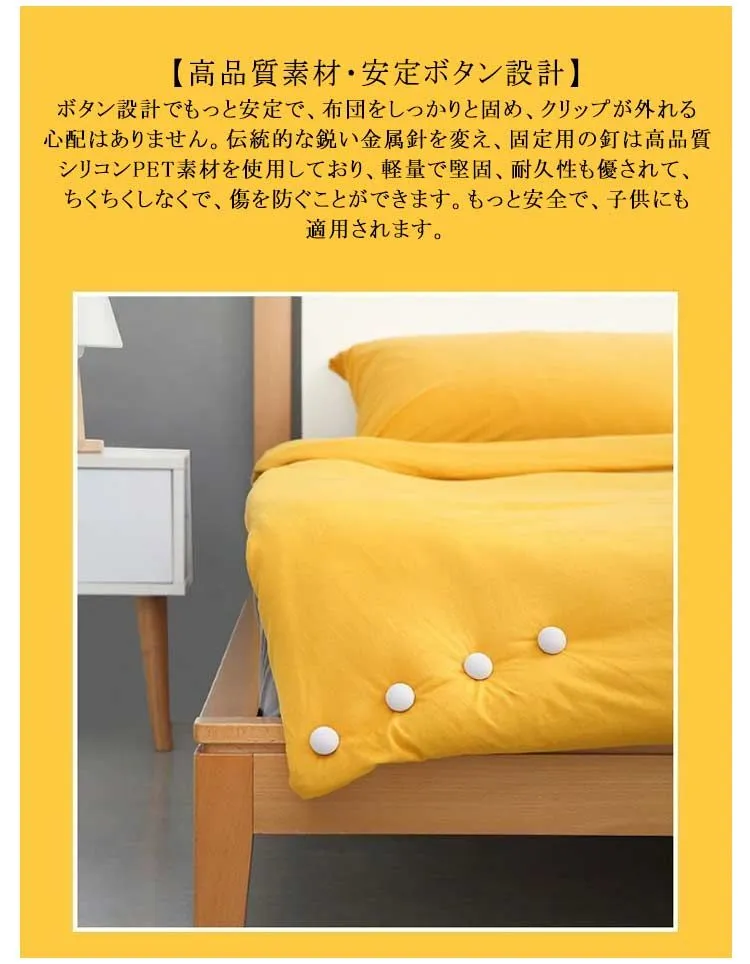 【高品質素材・安定ボタン設計】ボタン設計でもっと安定で、布団をしっかりと固め、クリップが外れる心配はありません。伝統的な鋭い金属針を変え、固定用の釘は高品質シリコンPET素材を使用しており、軽量で堅固、耐久性も優されて、ちくちくしなくで、傷を防ぐことができます。もっと安全で、子供にも適用されます。