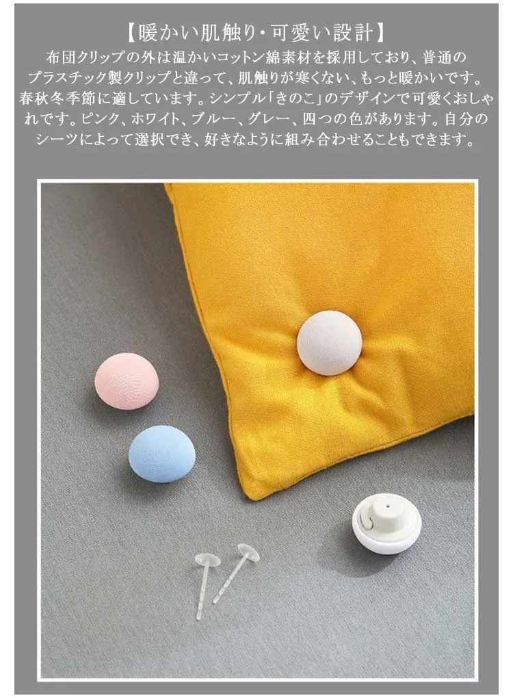 【暖かい肌触り・可愛い設計】布団クリップの外は温かいコットン綿素材を採用しており、普通のプラスチック製クリップと違って、肌触りが寒くない、もっと暖かいです。春秋冬季節に適しています。シンプル「きのこ」のデザインで可愛くおしゃれです。ピンク、ホワイト、ブルー、グレー、四つの色があります。自分のシーツによって選択でき、好きなように組み合わせることもできます。
