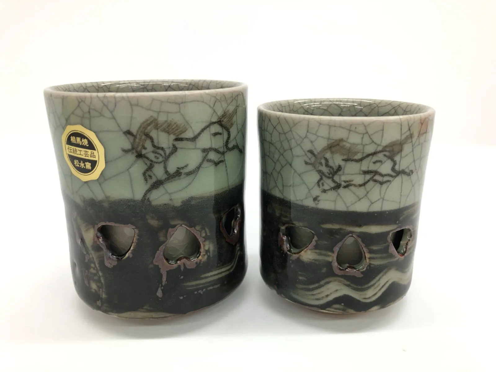 【未使用】保管品 相馬焼 松永窯 夫婦湯呑 夫婦湯飲み 組湯呑み 組湯飲み 長湯呑み 長湯飲み 二重 湯呑み 湯飲み 茶器 和食器 食器 陶器製 貫入 持っても熱くない 二重焼 馬図 伝統工芸 栞/箱付