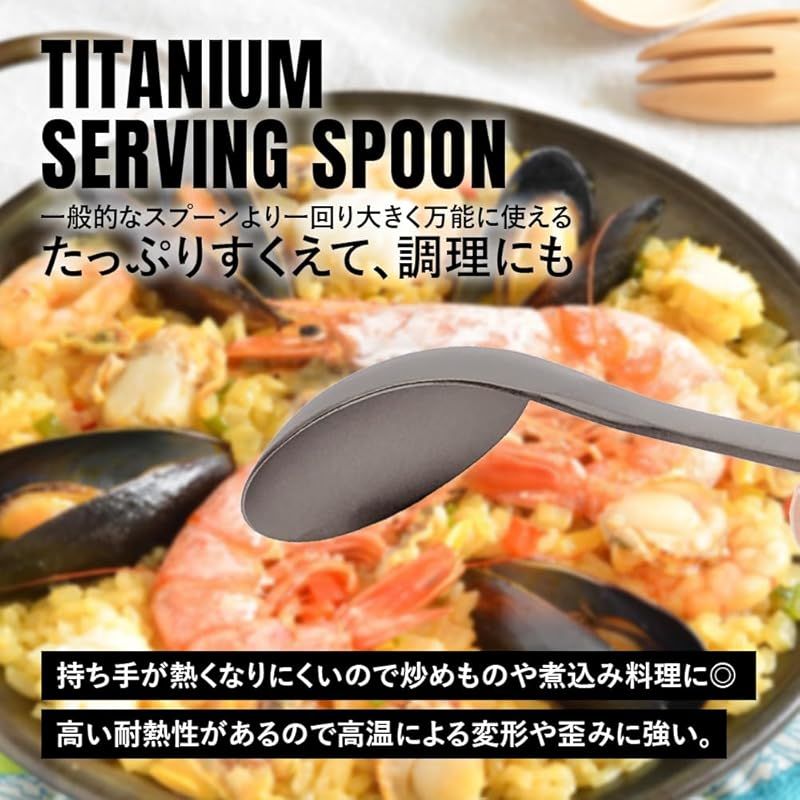 【商品説明】 軽量で頑丈、錆にも強いチタンサービススプーン。料理をたっぷりすくえる取り分けスプーン。スプーン部が広く、崩れやすい具材でもすくいやすい。切り分け、盛り付け、食材を和える、配る、タレやドレッシングをかけることもできます。扱いやすいサービングスプーンは一般的なスプーンより一回り大きく万能に使えます。 チタンは優れた耐食性でサビに強く、お手入れも簡単。食材に金属臭がついてしまうことがなく、食べ物の風味を損ないません。チタン製の調理器具は直火可能なので簡単な調理にも対応可能。持ち手が熱くなりにくいので、炒め物や煮込み料理にも。耐熱性が高く、熱に強いので高温による変形や歪みに強い。 優れた耐食性と耐久性、軽くて携行性の高いキャンプギア。持ち運びしやすいアウトドアギアはご家庭のキッチンはもちろん、ソロキャンプや登山などウルトラライト(UL)キャンプ、バーベキューなど様々なアウトドアシーンで大活躍。末永くお使いいただけるチタンギアは、緊急時や災害時の備えとしても。