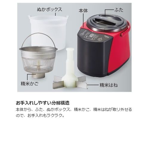 【仕様】 ・消費電力:300W ・精米容量:玄米 165〜825g ・外形寸法:22.7×30.1×23.6cm ・本体質量:3.6kg ・精米時間:2分45秒