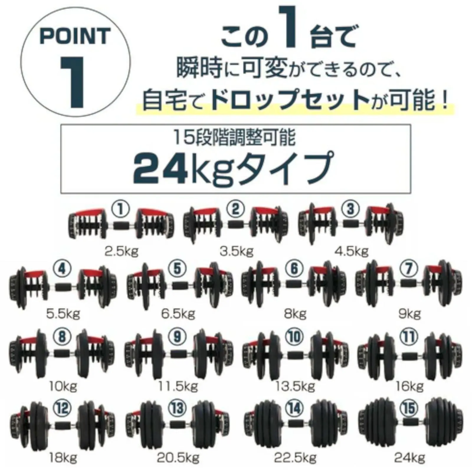 【ダイヤル数値はキロ表示】 従来のポンド表示ではなくダイヤル数値を採用しました。 ひと目みただけで設定・数値を確認できます。 15段階調整 可変式ダンベル 24kg2個セットタイプです。 軽い重量トレーニングから高重量トレーニングまでできます。