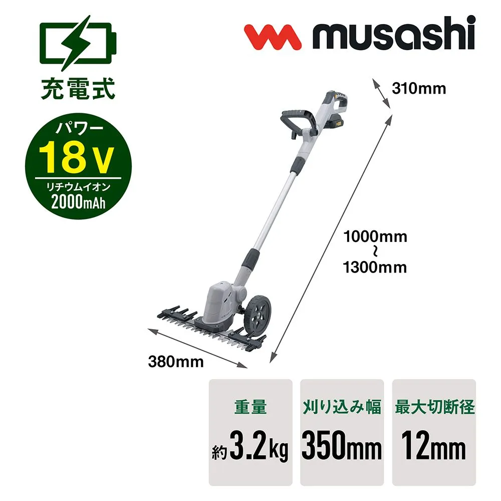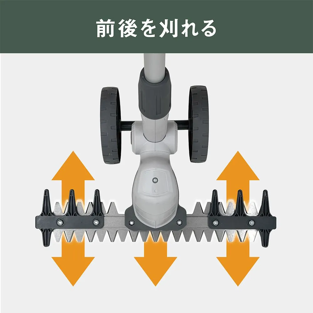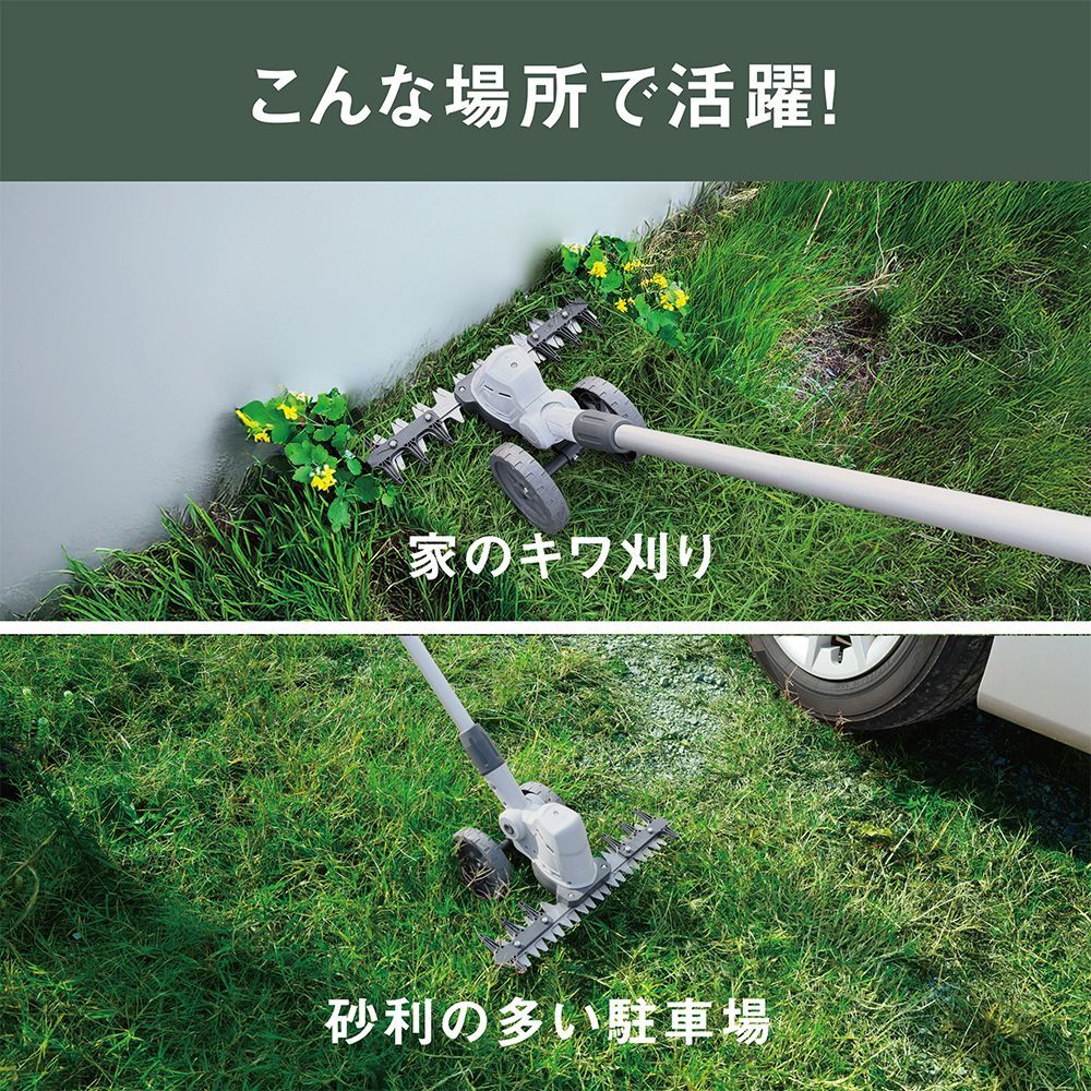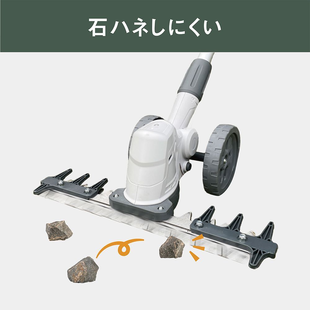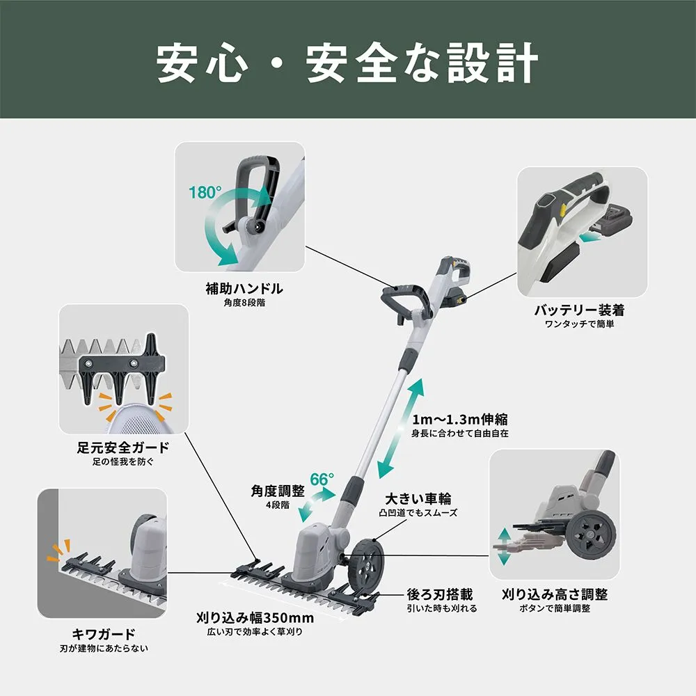 ■安心・安全設計 ・補助ハンドル(角度8段階) ・バッテリー装着(ワンタッチで簡単) ・足元安全ガード(足の怪我を防ぐ) ・4段階角度調整 ・キワガード(刃が壁にあたらない) ・広い刈りで効率よく草刈り(刈り込み幅350mm) ・ボタンで簡単に刈り込み高さ調整