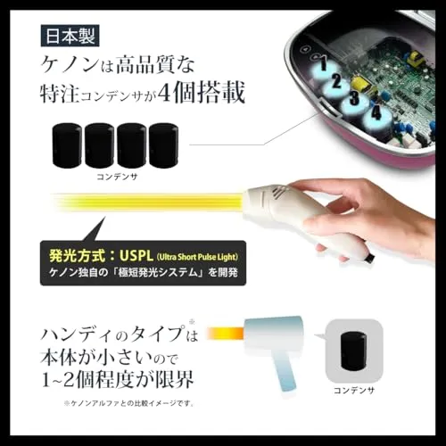 製品の性能を大きく左右するコンデンサを本体内部に4機も搭載し、肌質や使用部位にあわせて光の強さを10段階から自由に調節可能です。