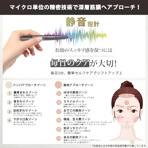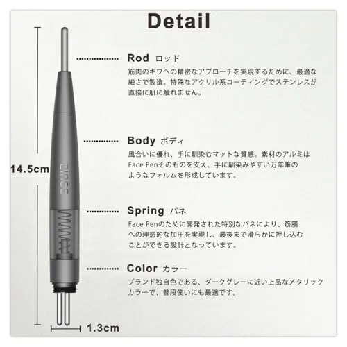 【FaceMassagerPenを選ぶ】 表情筋をしっかり使わないと、筋膜が癒着し、さまざまなエイジ ングサインの原因になります。しかし、筋膜リリースは深層の筋膜に働きか ける必要があり、セルフケアだけでは限界があります。筋膜の癒着をほぐすためには、筋膜に対して適度な圧を加える必要があります。しかし、筋膜に適切に加圧することはとても難しく、プロの技術が必要です。その技術をお家で再現できるようにしたのがこの「Face-Pusher」。自分の手で適切に圧力を調節出来るので、ピンポイントに深部まで圧力を加え、お顔のコリに適切にアプローチします。
