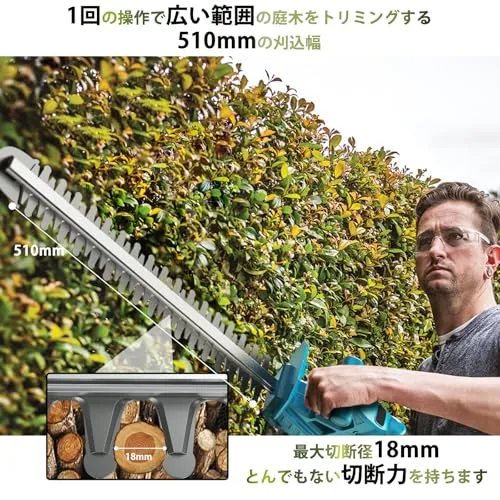 ヘッジトリマー 充電式 電動ヘッジトリマー 18Vマキタバッテリー対応可能 刈込幅510mm/切断径18mm 両刃駆動 高速往復刈り 剪定 トリマー 電動トリマー ガーデントリマー 生け垣トリマー 剪定バリカン 生垣バリカン 植木バリカン 草刈りバリカン 充/