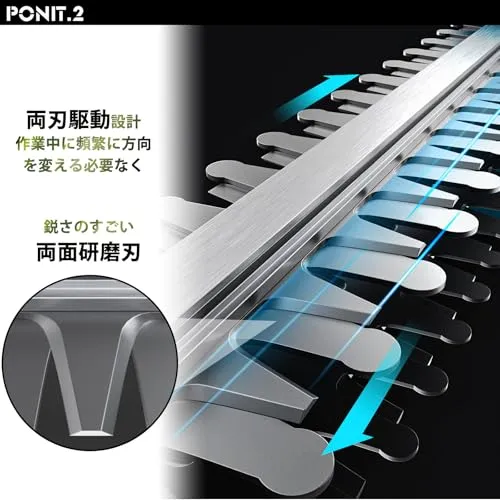 【トップクラスの刈込幅/切断径、両刃駆動】この充電式ヘッジトリマーは切断径は18mm、刈込幅510mmの仕様で、広い切断範囲と強力な切断能力を持ちます。1回の操作で広い範囲の庭木を効率よくトリミングすることができて、剪定効率を大幅に向上させます。両刃駆動のブレード設計は作業中に頻繁に方向を変えずに使えるため、単刃駆動より便利な操作ができるようになります。