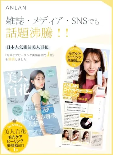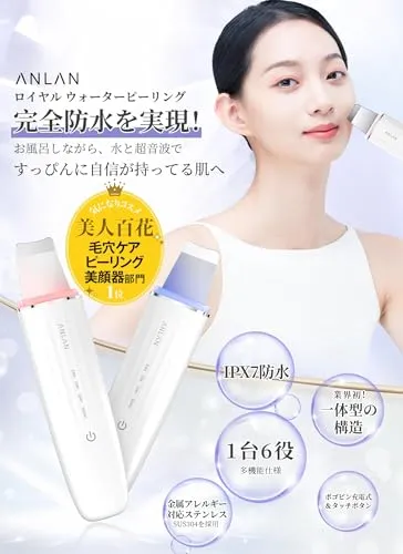 「ANLAN ロイヤルウォーターピーリング、美人百花毛穴ケアピーリング美顔器部門NO1を受賞」ANLAN初めの完全防水式ウォーターピーリング美顔器。業界初!一体型の構造を採用し側面に隙間はない。そして最新のタッチ式電源ボタンとポゴピン充電端子をアップデートして水の侵入を完全に隔絶、IPX7完全防水を実現!水と超音波ですっぴんに自信が持ってる肌へ。