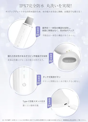 「IPX7完全防水&丸洗い可能」4つのアップグレードでロイヤルウォーターピーリングを完全防水を実現!?業界初!一体型の構造を採用し(市販品は分体式です)、?ポゴピン充電端子(充電口がなく、水の侵入を防ぎます)?タッチ式ボタン(ボダンの周りに隙間がなく)?Type-C充電スタンド付き、本体を置くだけ充電できます。