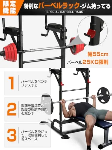 【ご注意:バーベル耐荷重制限は25kgです。】この一台で圧倒的効果で、マルチジムに足を運ばなくても、空いた時間や気の向いた時にすぐ自宅で全身のトレーニングができます!!