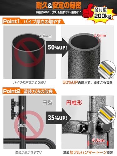 【安定性が抜群な設計・π字型を採用する・もっと厚くパイプを利用】自主開発の原理に従って、チンニングスタンドの土台はπ字型構造で、前後延長し、二重安定になります。H字設計より、40%の面積を拡大され、安定性も3倍を向上されます。適当な足元面積