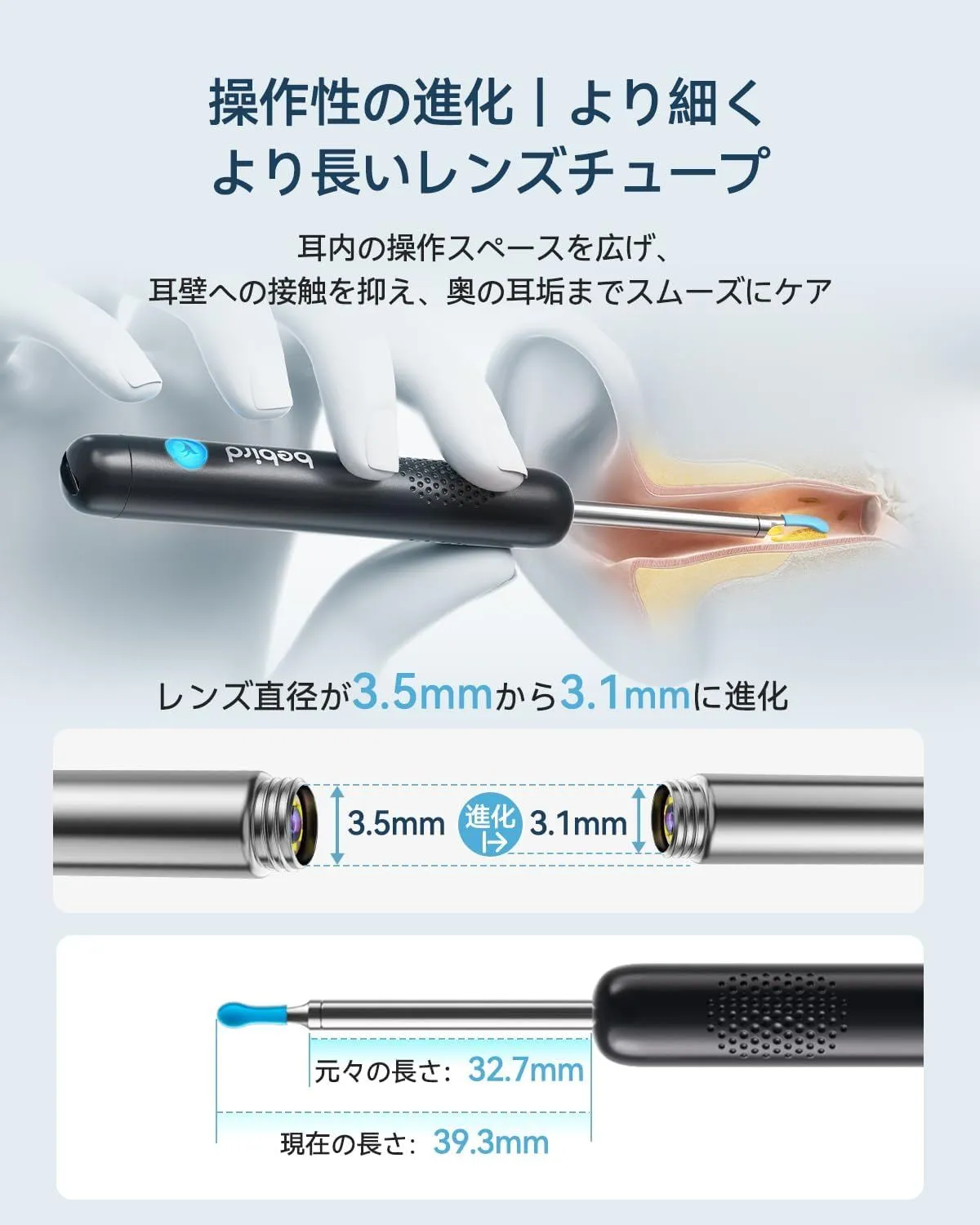 【業界最細クラス3.1mm極細レンズで快適操作】 第三世代R1は業界最細クラスの3.1mm極細レンズ採用。耳道内の操作スペースが広がり、挿入時の負担を軽減。さらに、チューブの長さを39.3mmにまで延長し、耳の奥までしっかり届く設計で、これまで見えなかった領域までくまなく観察できます。