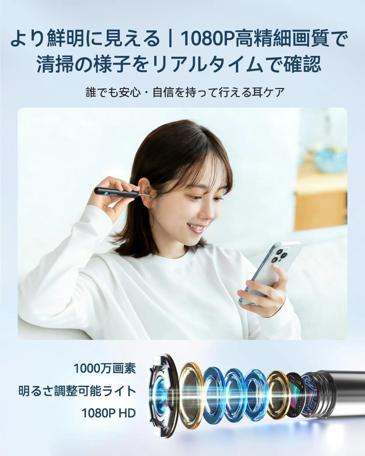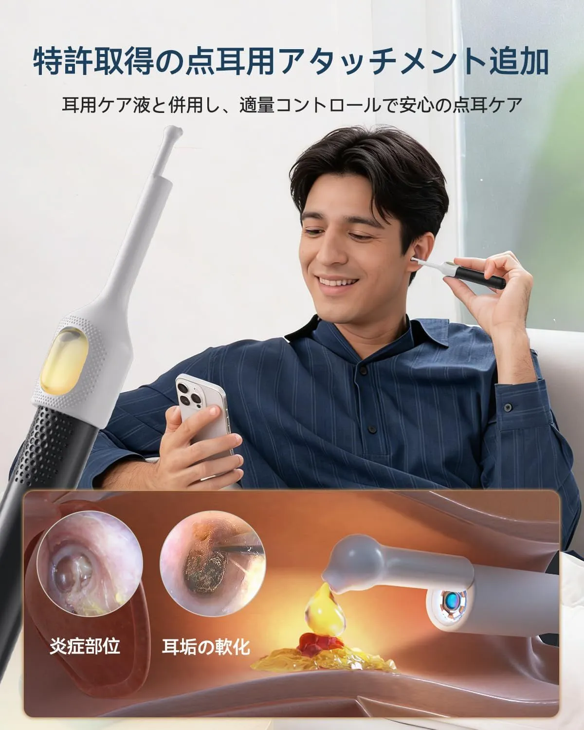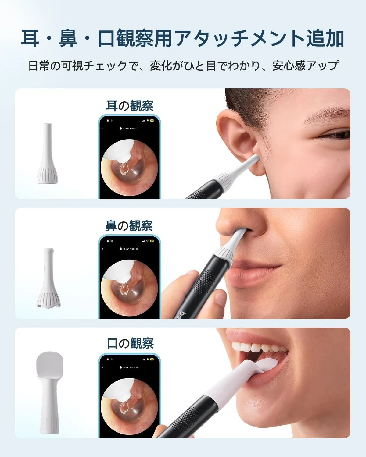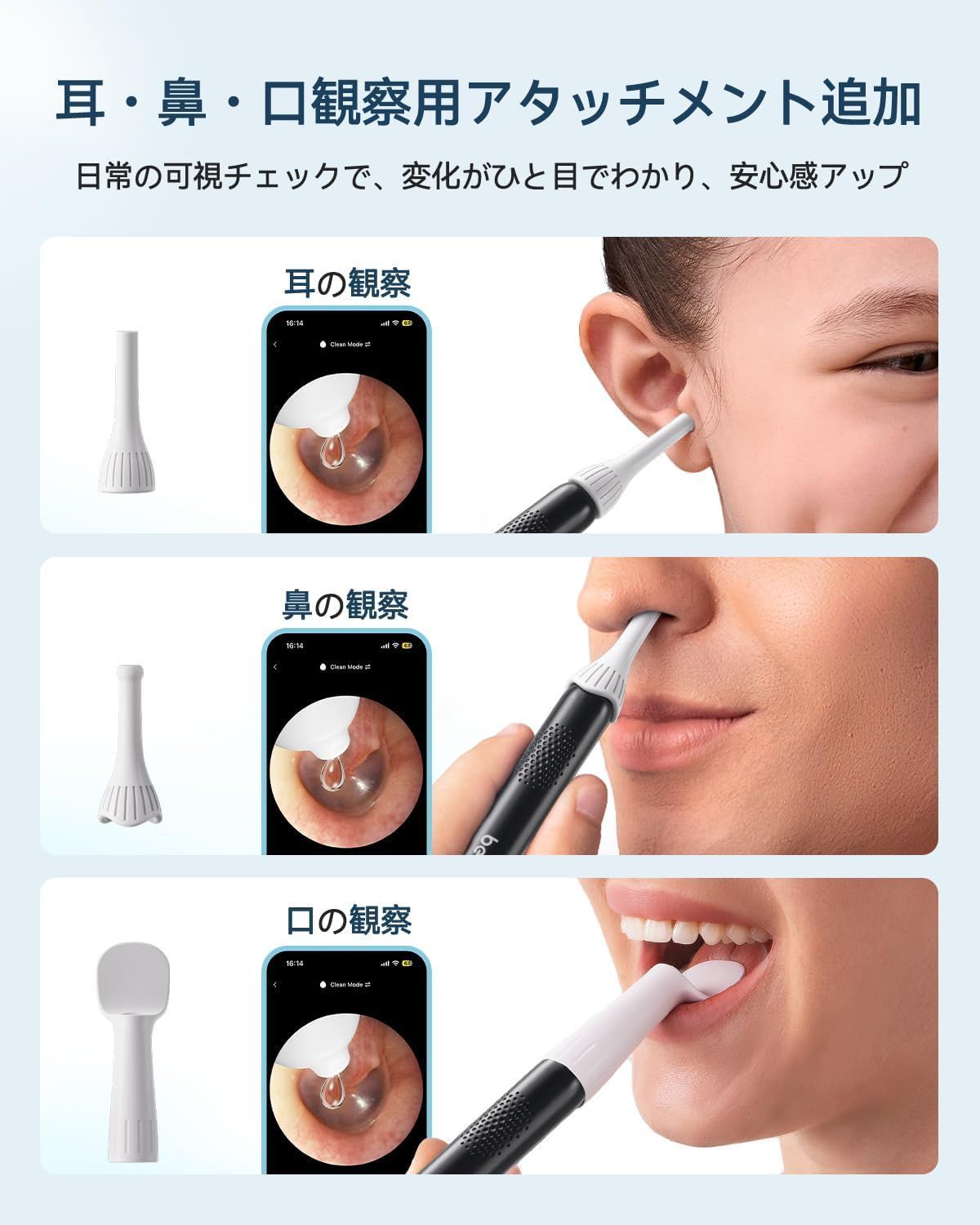 【充実の付属品で多様なニーズに応える】 乾性・湿性両方の耳垢に対応した豊富な耳かき先端に加え、耳・鼻・口の観察用アタッチメント、専用ピンセット、点薬サポートツールを同梱。あらゆる使用シーンとユーザーの多様な要求にお応えします。