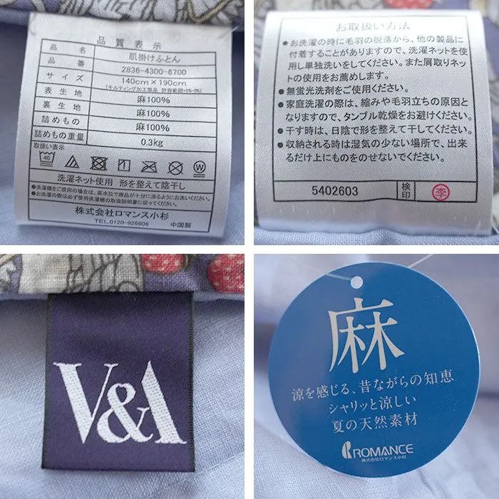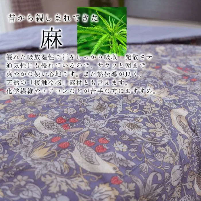 【V&Aコレクション ウイリアムモリス いちご泥棒柄】 生地から中わたまで全て麻を使用したオール天然素材の肌掛けふとんです。 麻独特のひんやり感で夏でも気持ち良くお使いいただけます。 吸放湿性に優れた麻を100%使用。 汗をしっかり吸収・発散させ、通気性にも優れているので、サラッと朝まで爽やかな使い心地です。 本麻肌掛けふとん 肌掛けふとん 140×190cm(シングル) カラーはブルー、ピンクの2種類からお選びいただけます。 見た目にも華やかなデザインで贈り物にも最適。 母の日、記念日、誕生日、敬老の日などの プレゼントとしても喜ばれますよ。