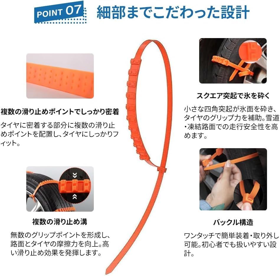 【タイヤにやさしく簡単装着】タイヤ接触面には細かな滑り止めポイントを配置し、ズレを防ぎながらタイヤを傷つけにくい設計。バックル式で工具・ジャッキ不要、初心者でも短時間で装着・取り外しが可能です。複雑な手順は一切なく、女性や緊急時でもスムーズに取り付けます。
