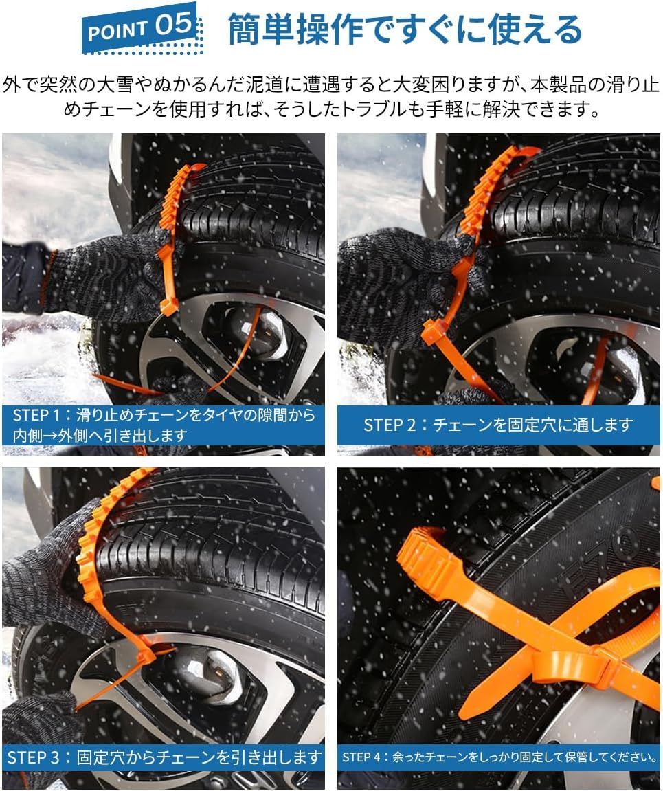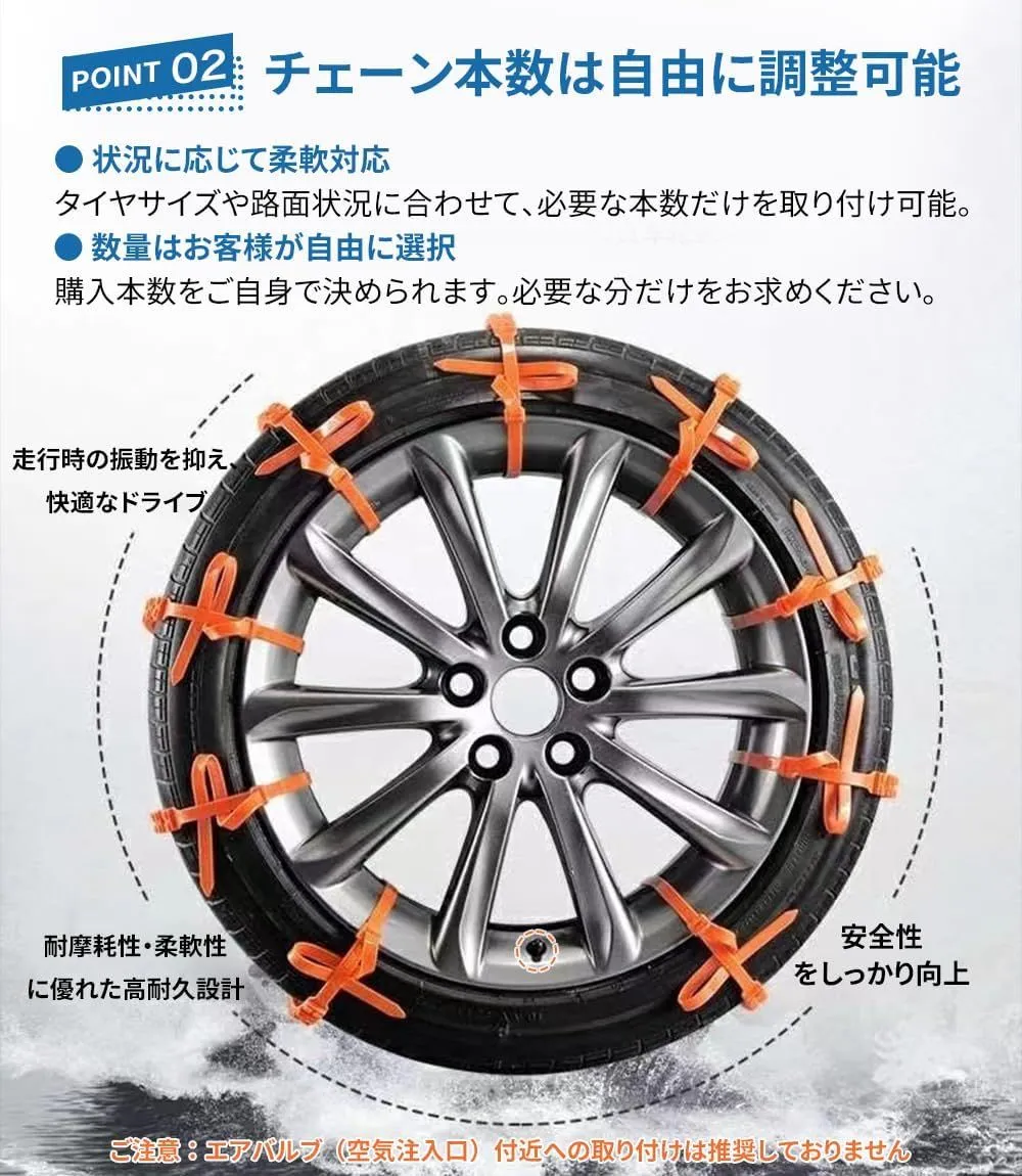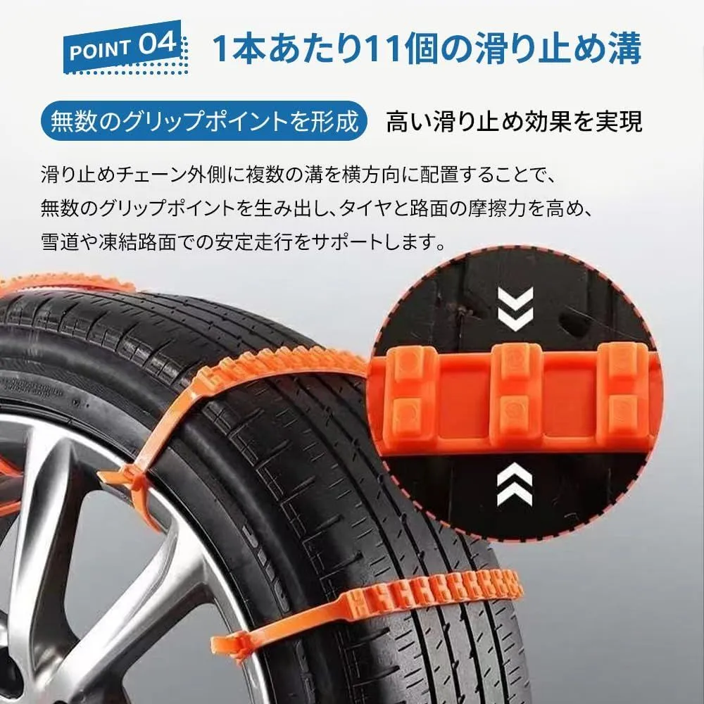 【本数が多い・安心感アップ】装着数を増やすことで接地面積とグリップ力が向上し、雪道やぬかるみ路面でもより安定した走行を実現。必要本数を自分で調整でき、無駄なく使えます。